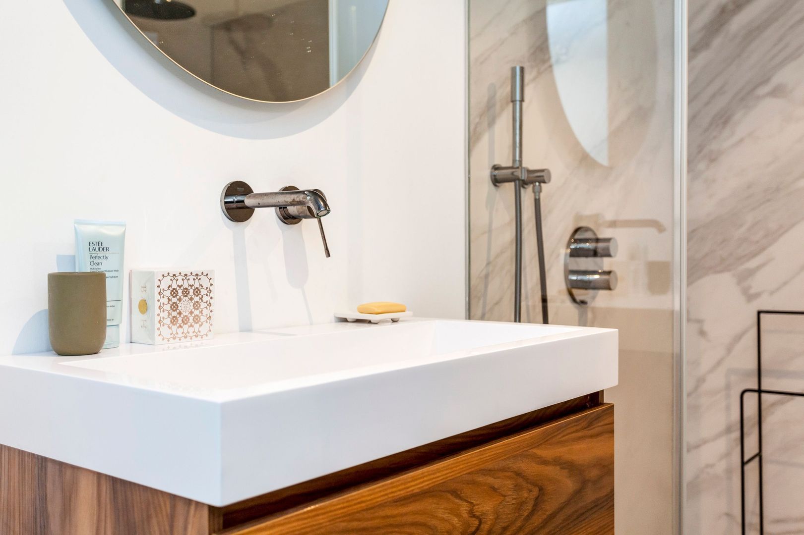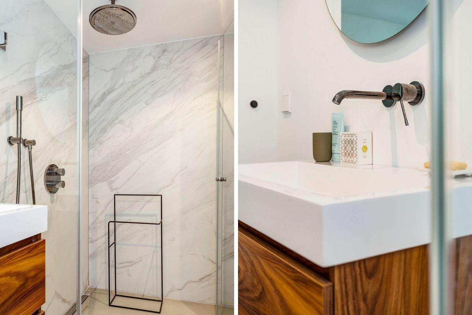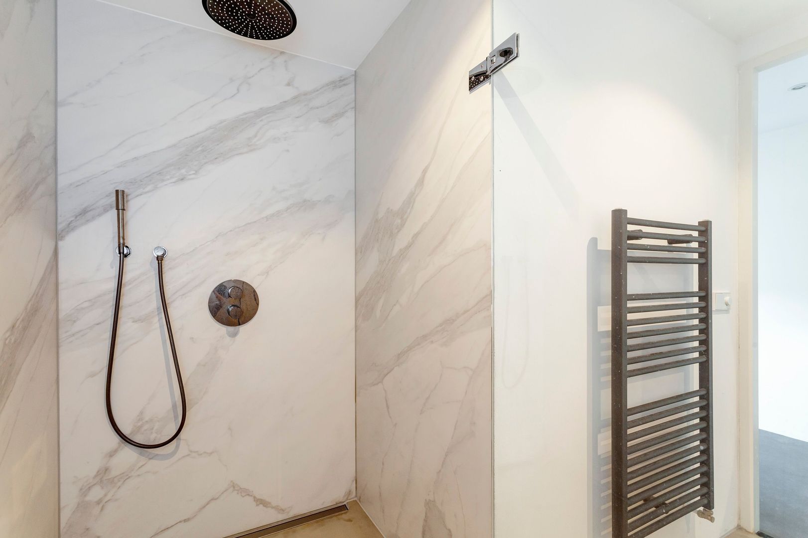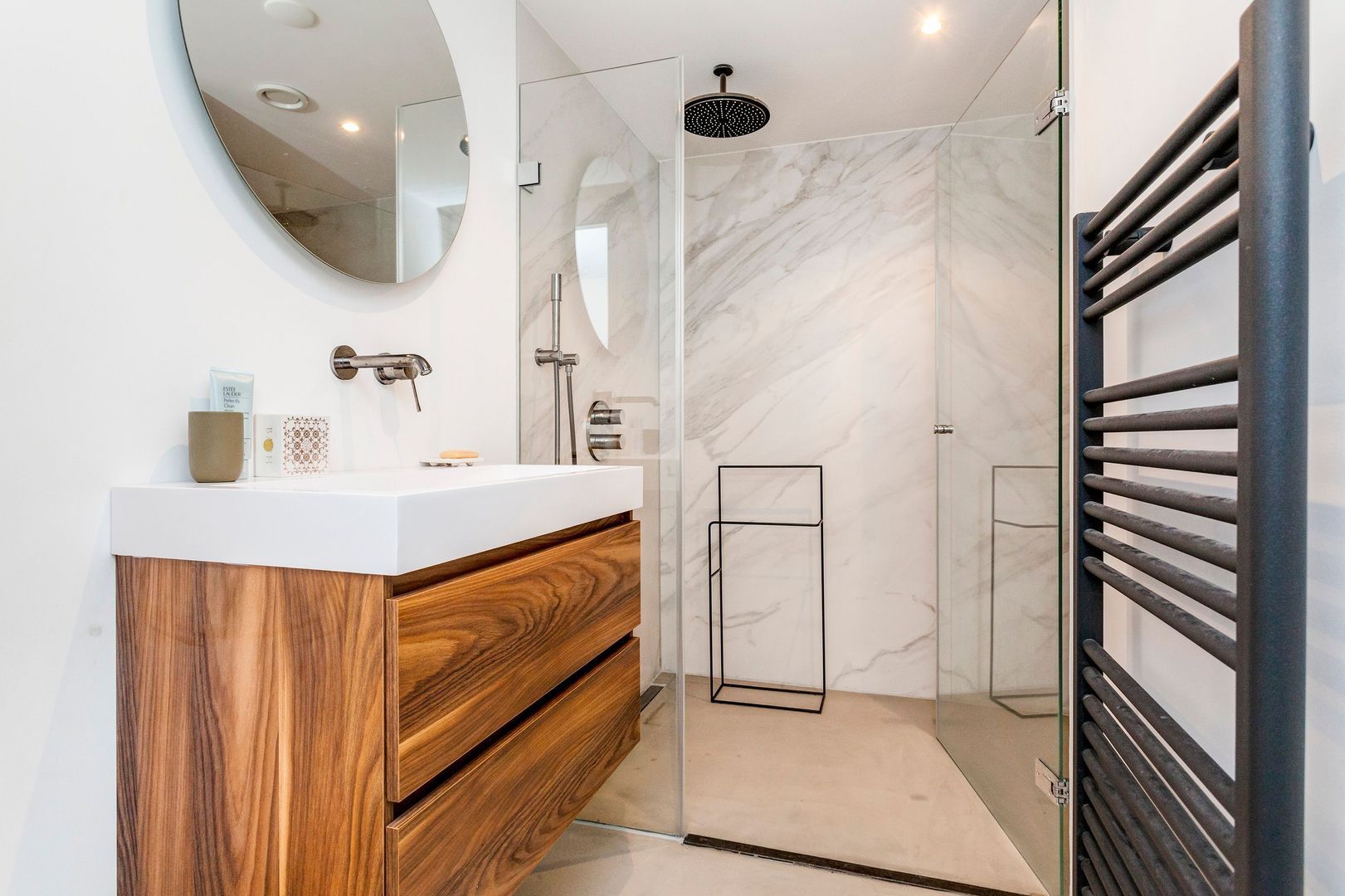 Fraaie badkamer met grote (dubbele) inloopdouche en wastafel met meubel.