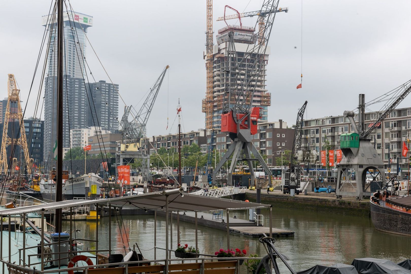in de Leuvehaven naar de groeiende skyline van Rotterdam.