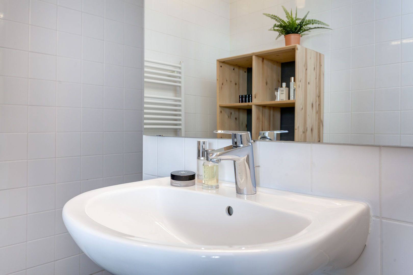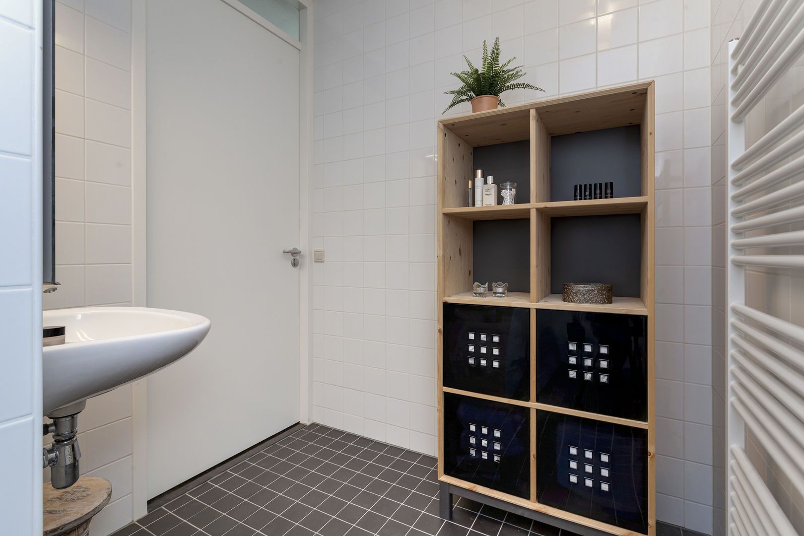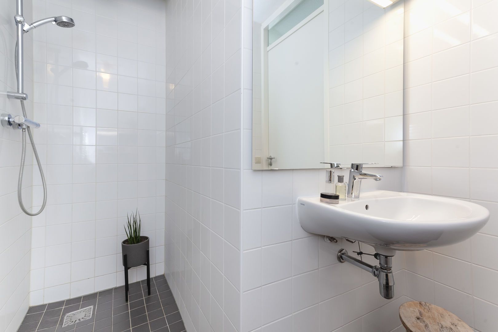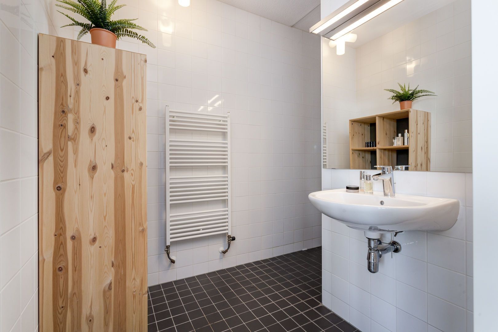 Badkamer met wastafel, inloopdouche en wandradiator.