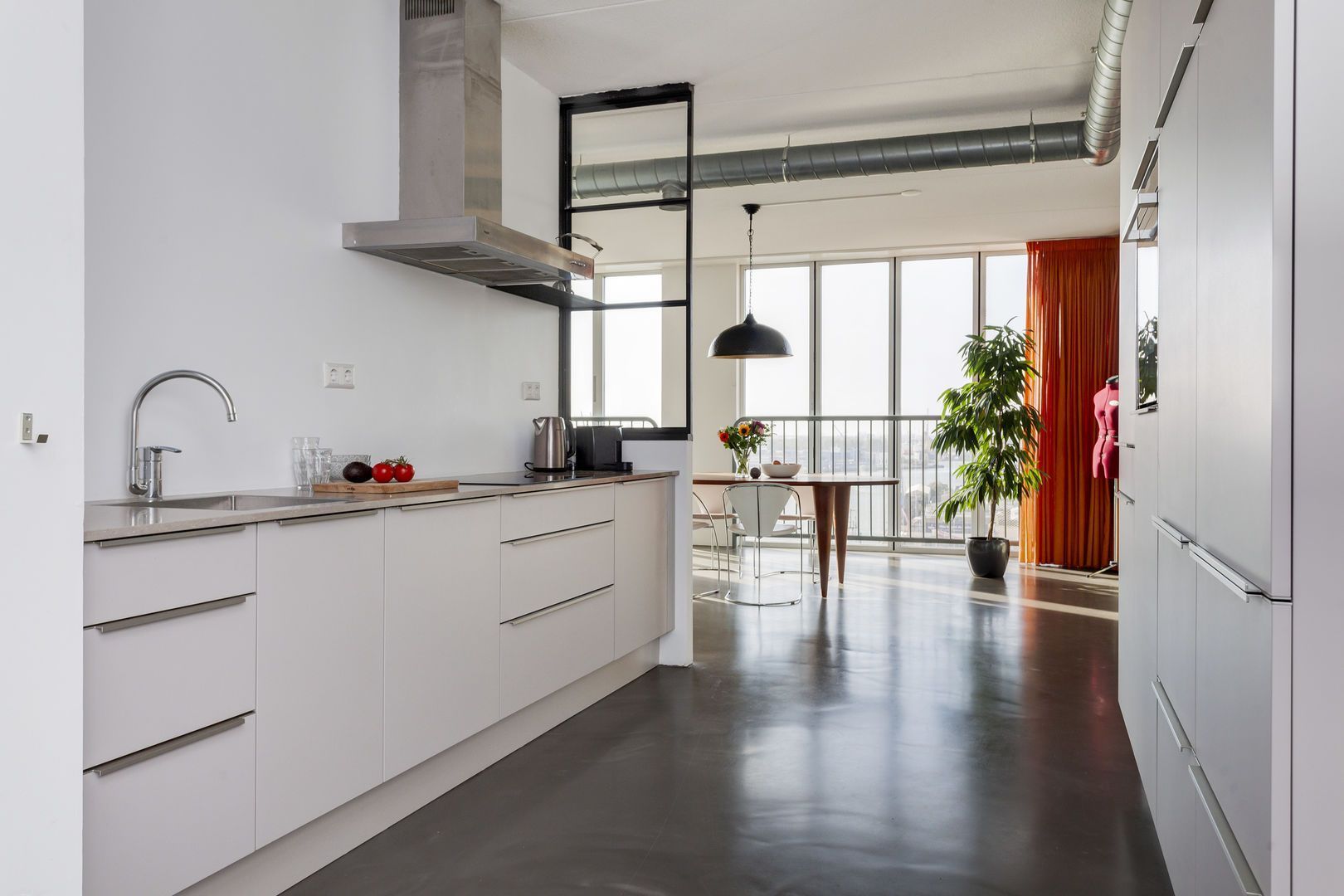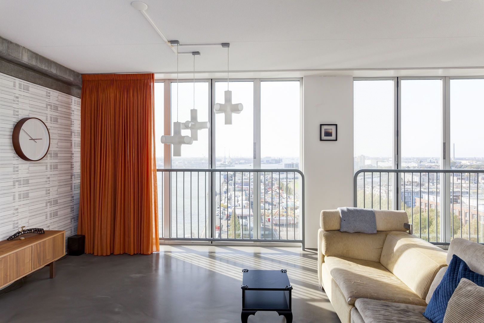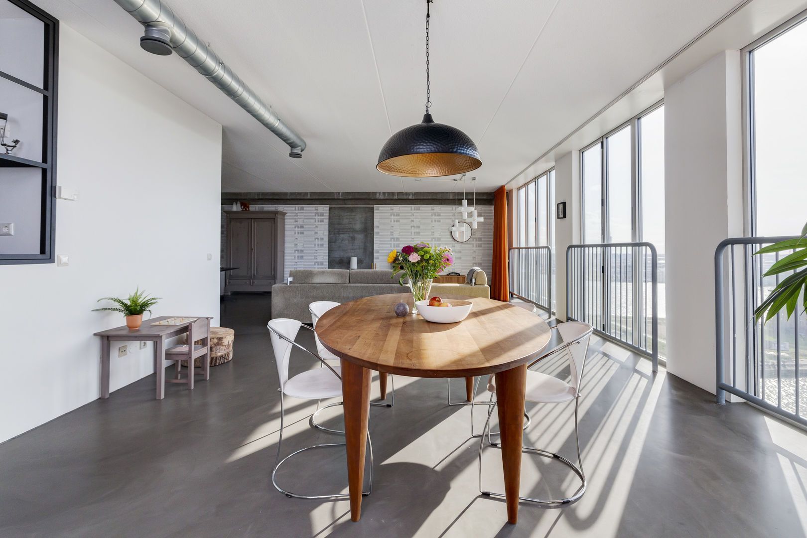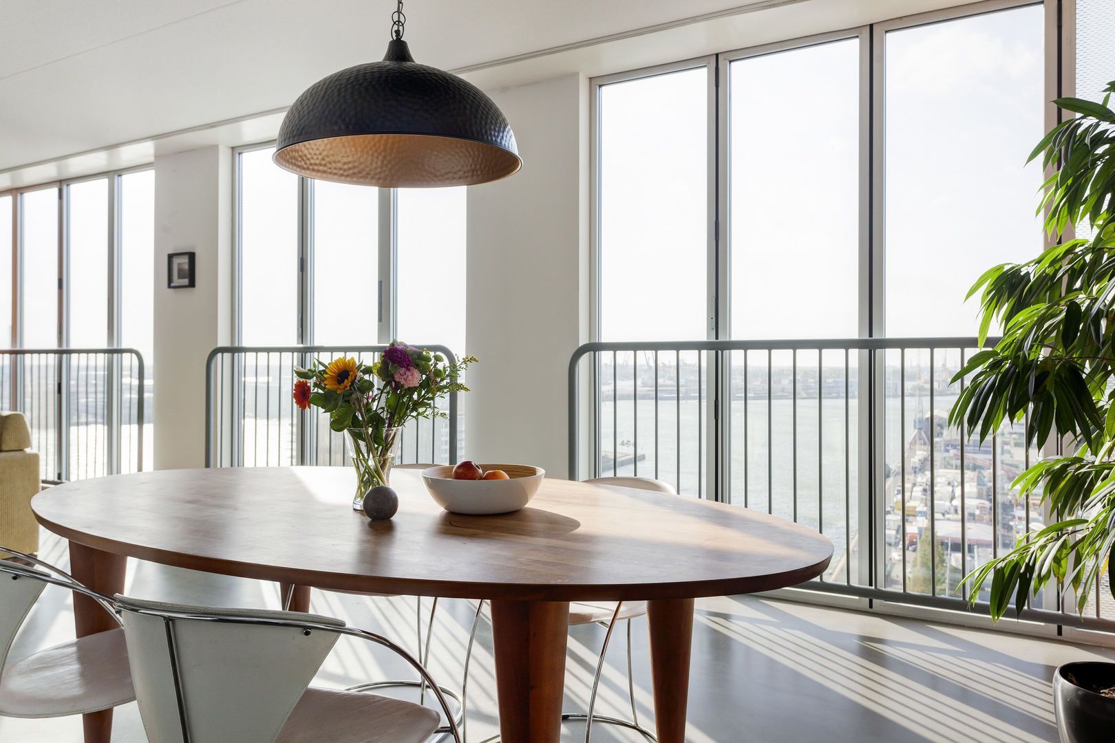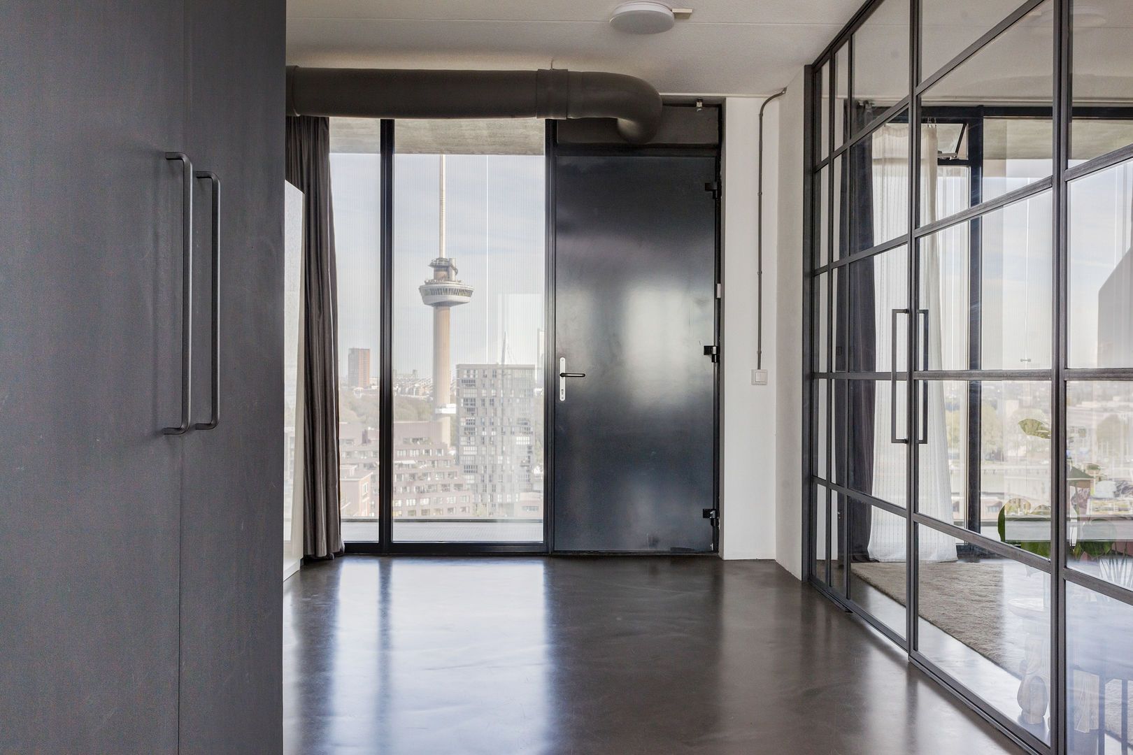 Zeer lichte leefruimte (1), (inclusief keukenruimte) ca. 100m2 met, dankzij de glazen gevel met harmonica ramen van vloer tot plafond, een fantastisch uitzicht over de Lloydpier, Nieuwe Maas en de Rotterdamse haven.