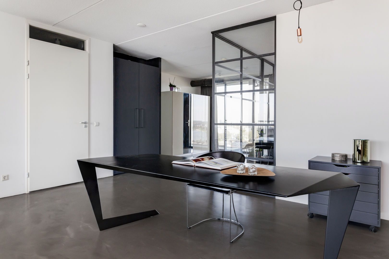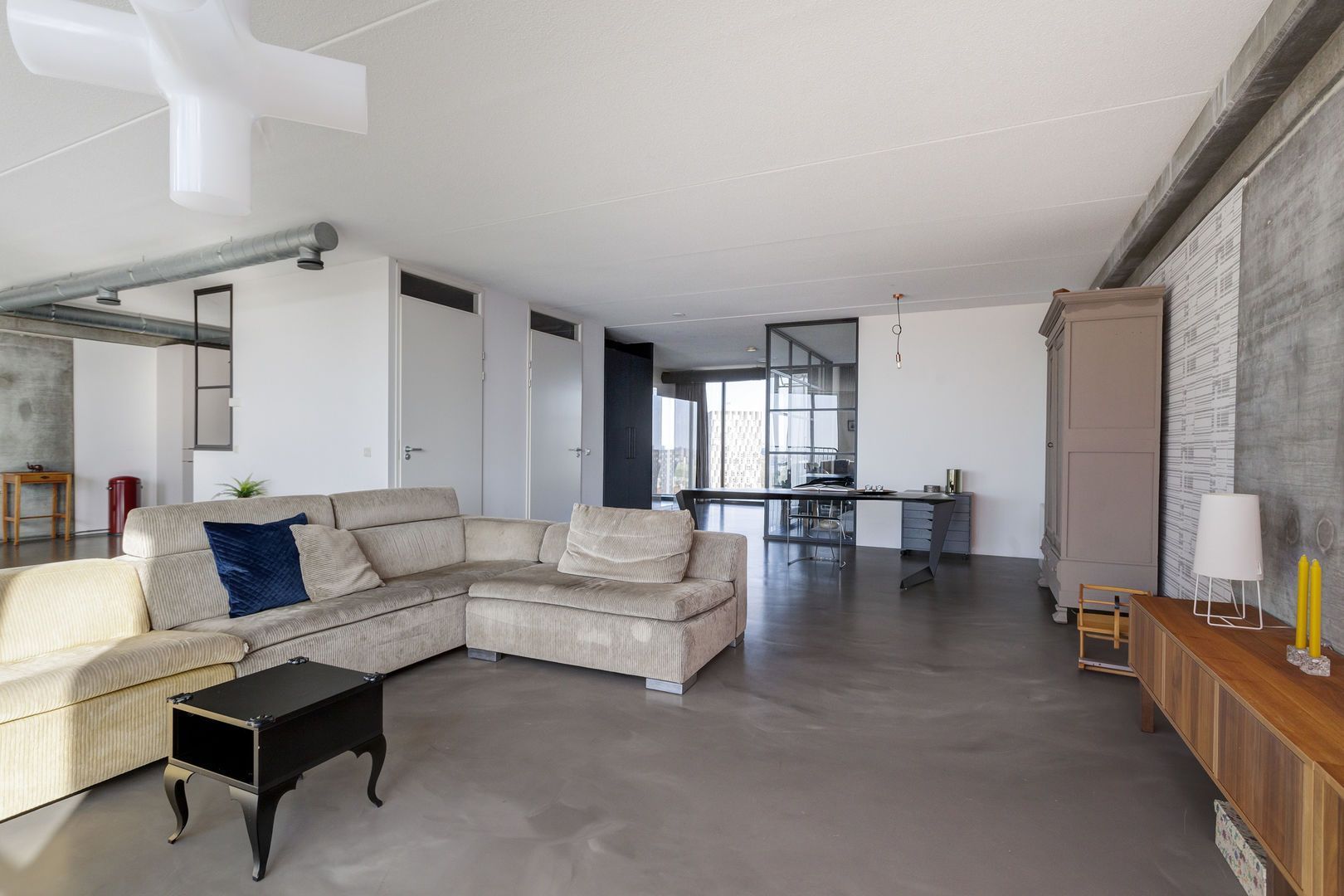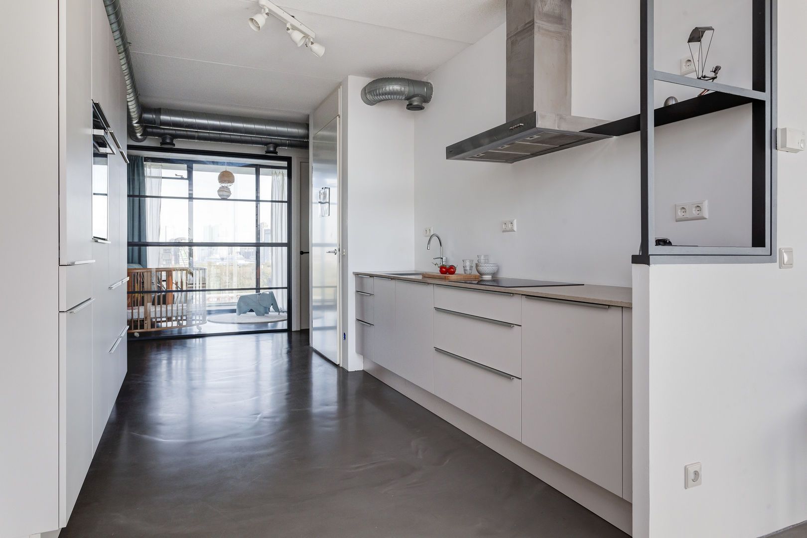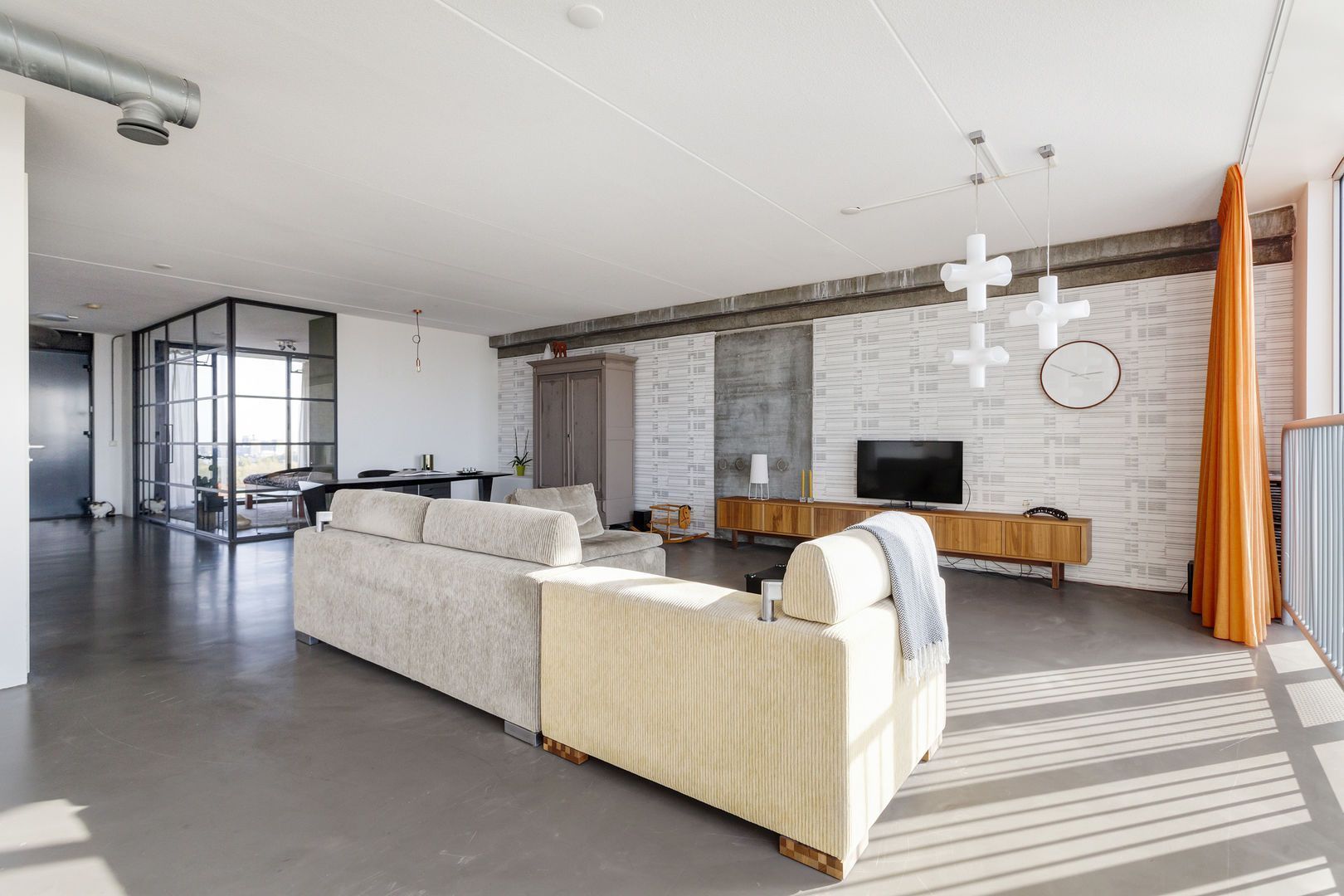 Zeer lichte leefruimte (1), (inclusief keukenruimte) ca. 100m2 met, dankzij de glazen gevel met harmonica ramen van vloer tot plafond, een fantastisch uitzicht over de Lloydpier, Nieuwe Maas en de Rotterdamse haven.