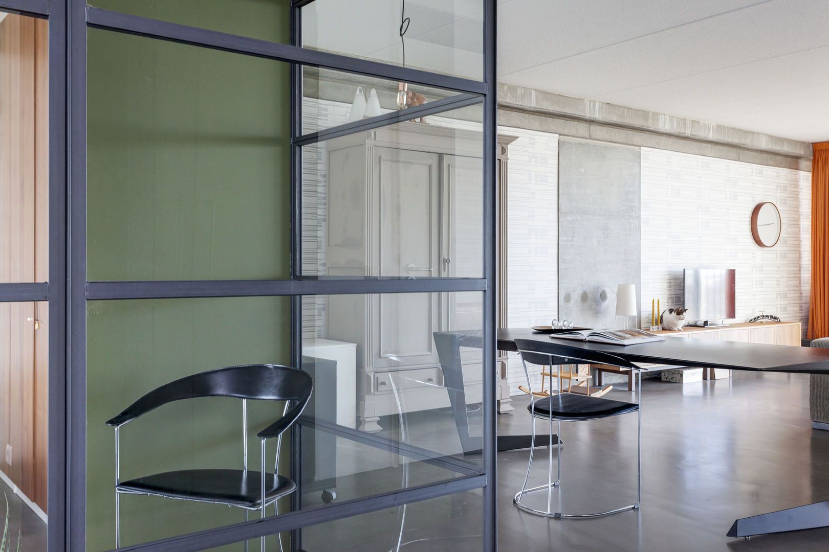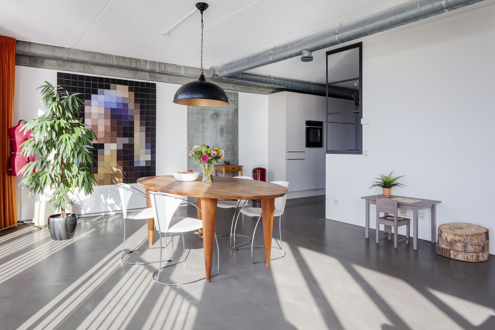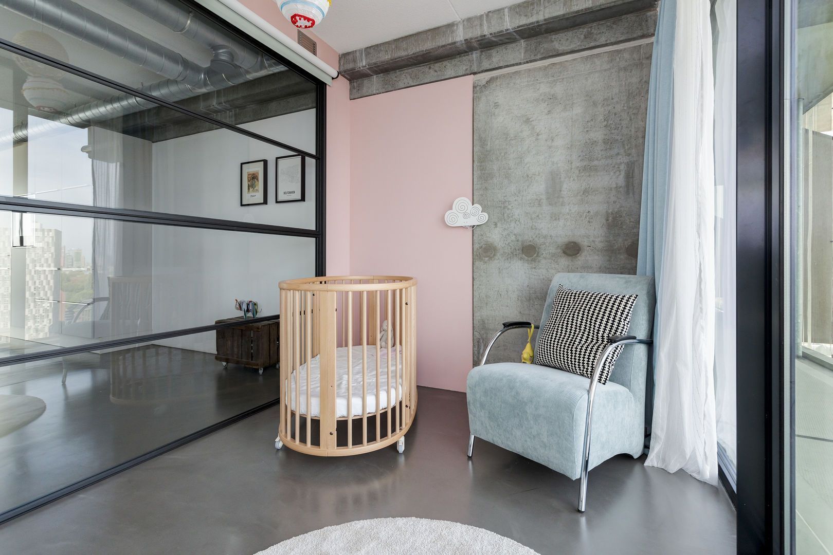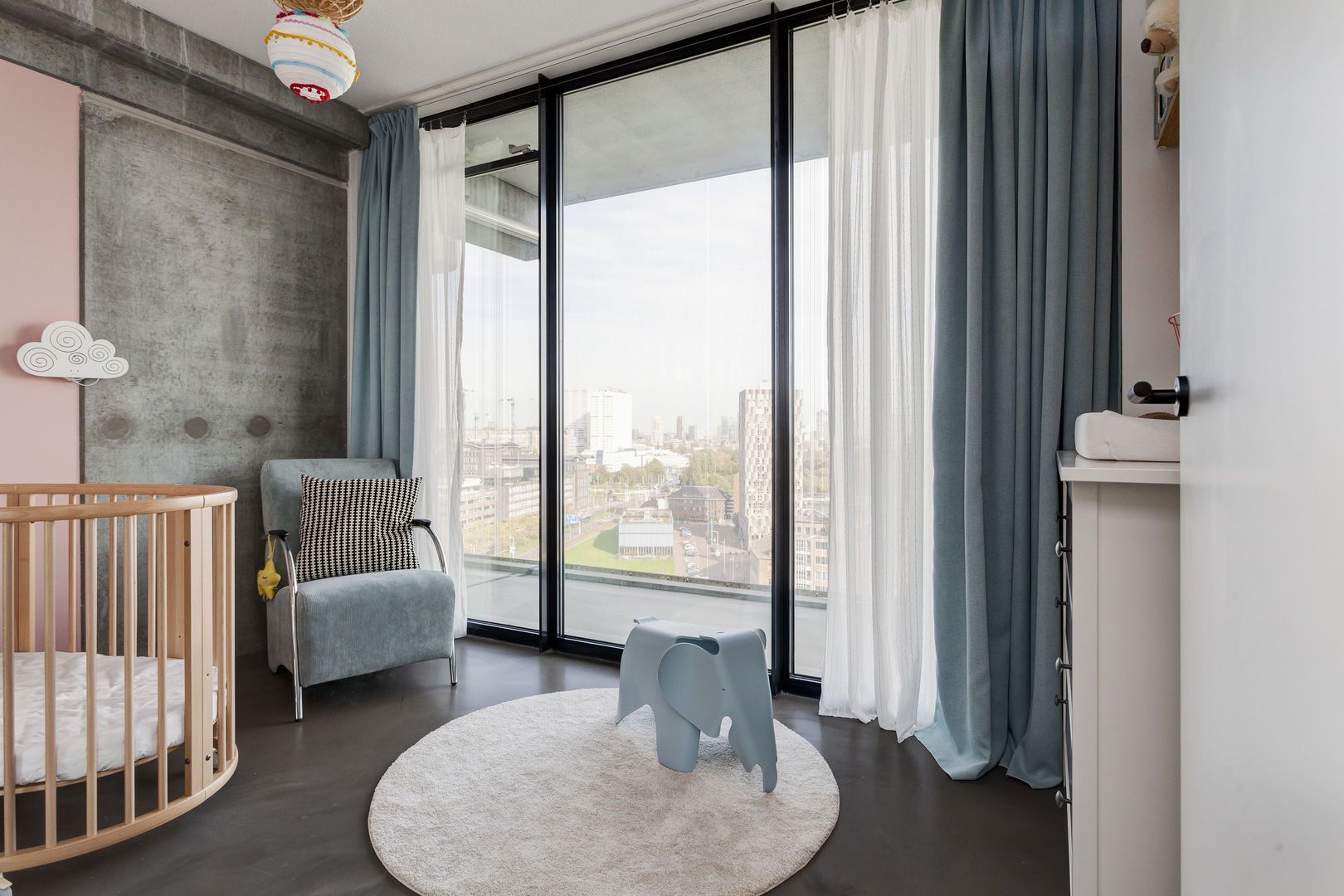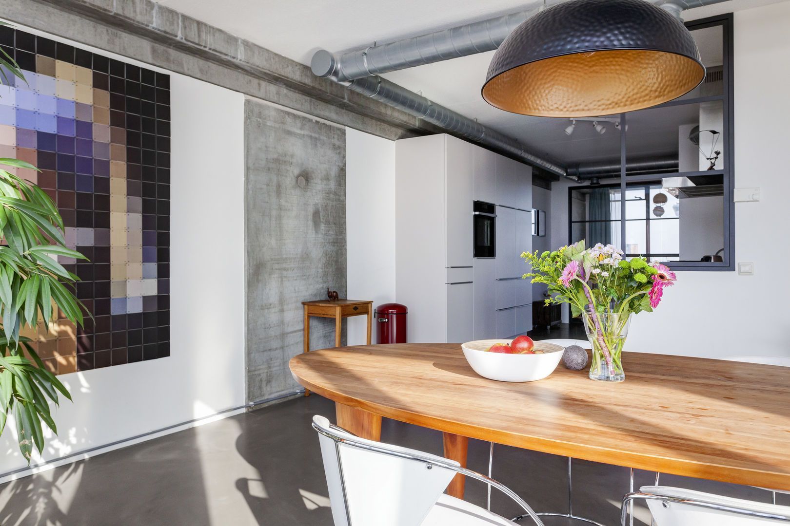 Zeer lichte leefruimte (1), (inclusief keukenruimte) ca. 100m2 met, dankzij de glazen gevel met harmonica ramen van vloer tot plafond, een fantastisch uitzicht over de Lloydpier, Nieuwe Maas en de Rotterdamse haven.