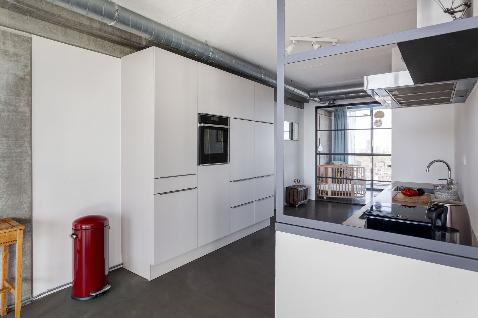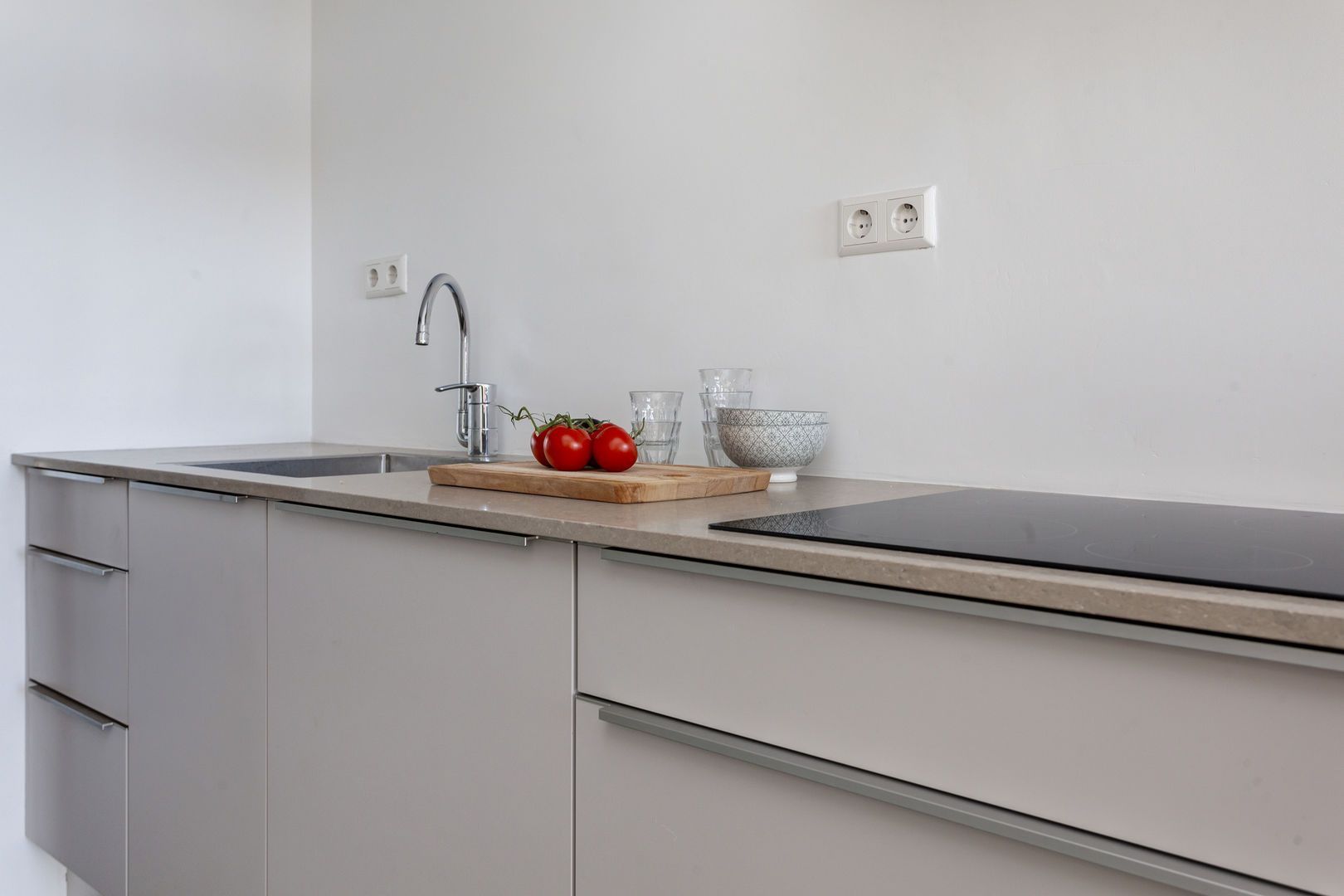 Keuken voorzien van moderne opstelling met inductiekookplaat, oven, vaatwasser en koelkast.