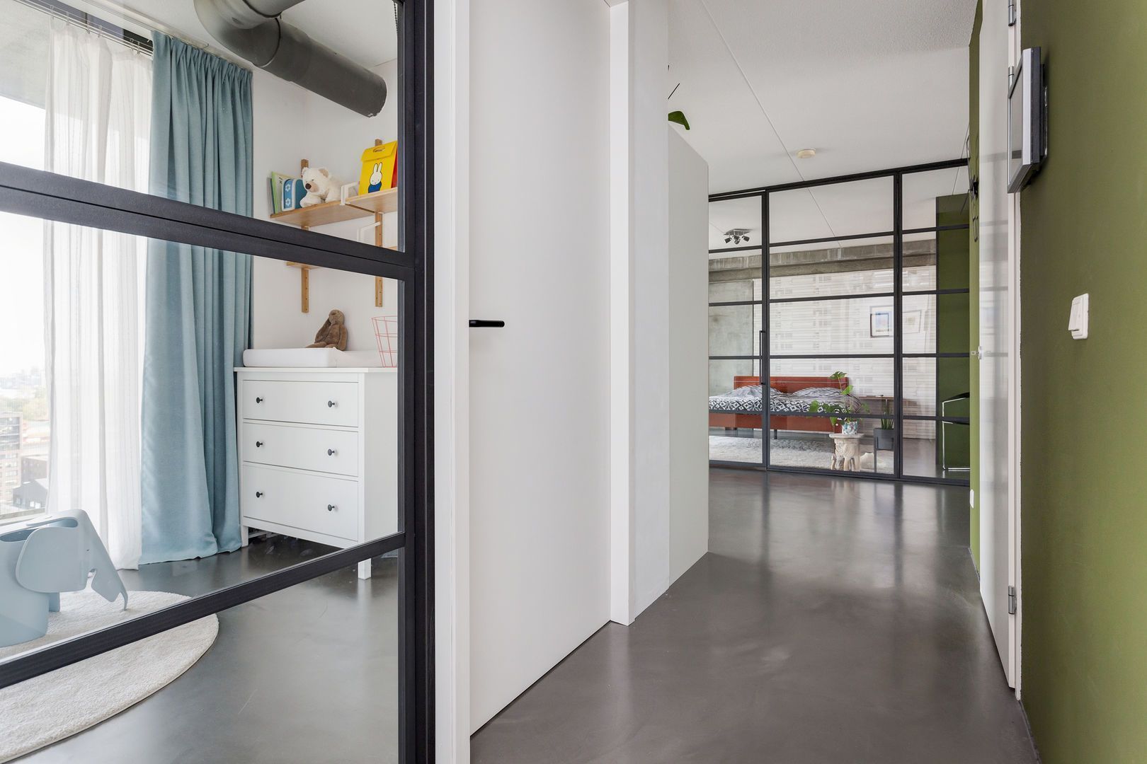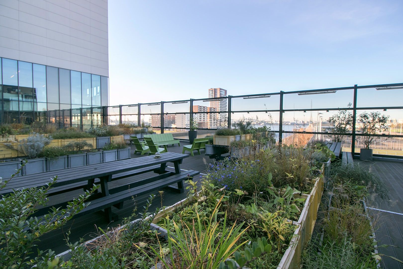 De vele glazen harmonicagevels openen het huis letterlijk en zorgen voor ‘inpandige buitenruimte’, goed gelegen aan de middag- en avondzonzijde. Een grote gemeenschappelijke tuin met terrassen en loungebanken is eenvoudig te bereiken.