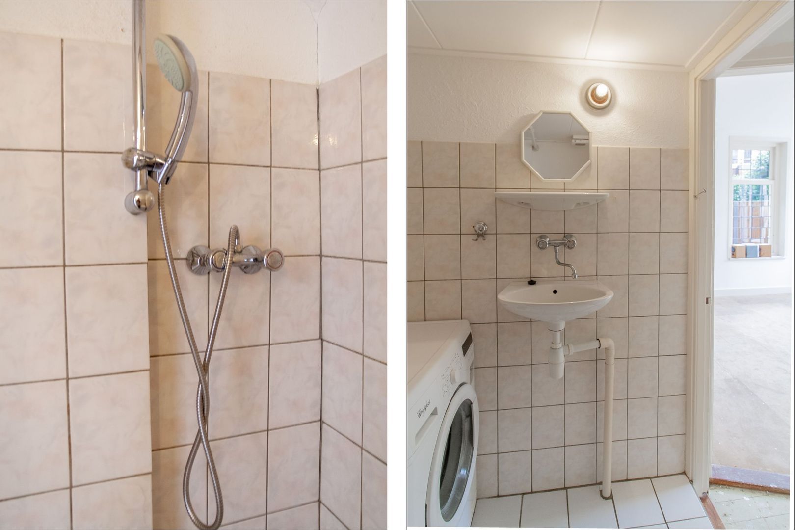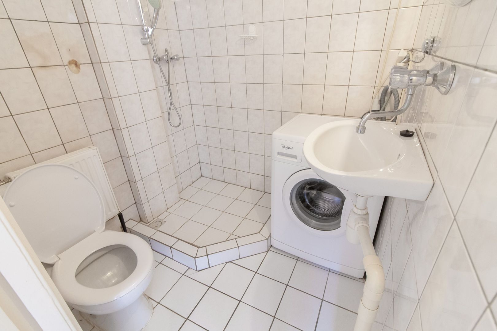 Badkamer met douche, wastafel, toilet en wasmachine-aansluiting.