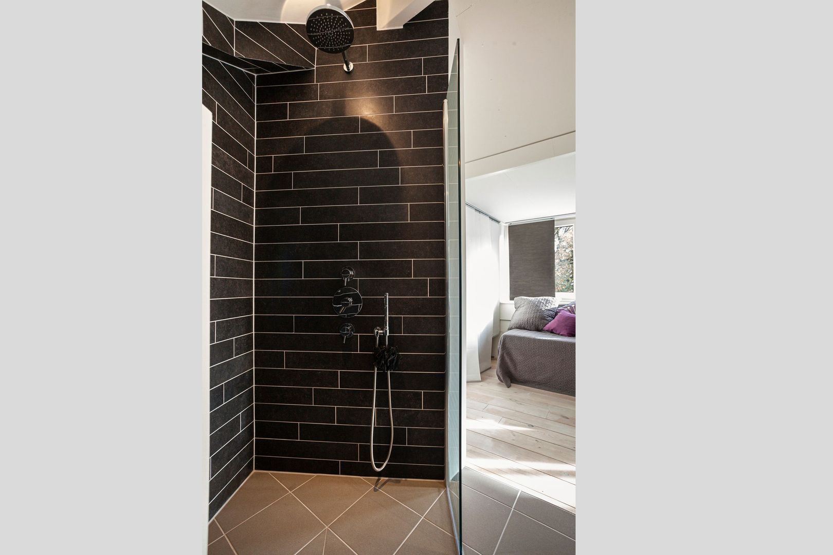 ’open’ badkamer met inloopdouche, meubel met wastafel en hangcloset.
