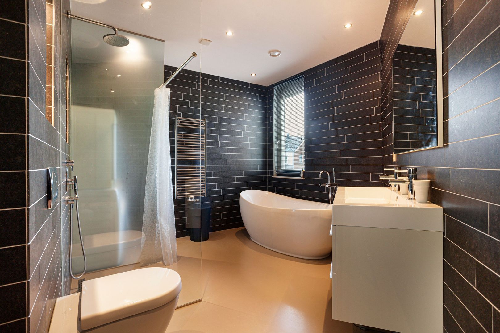 Badkamer met inloopdouche, vrijstaand bad, meubel met 2 wastafels, hangcloset.