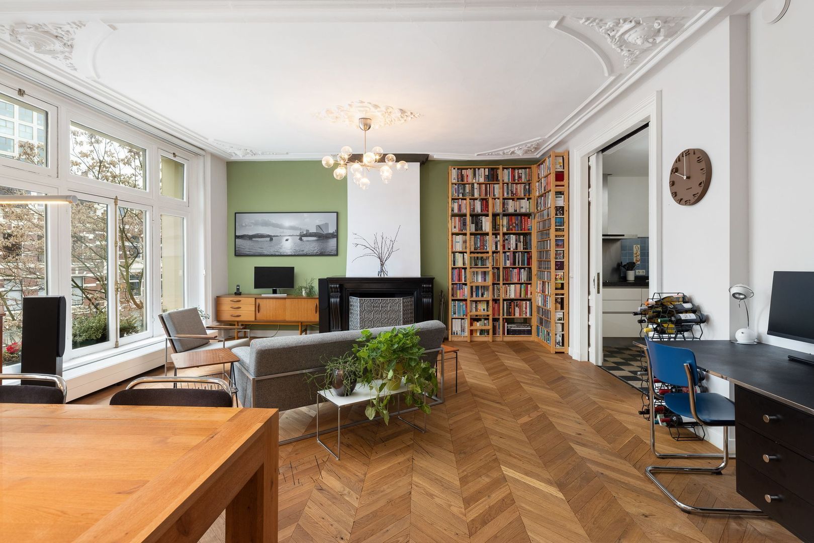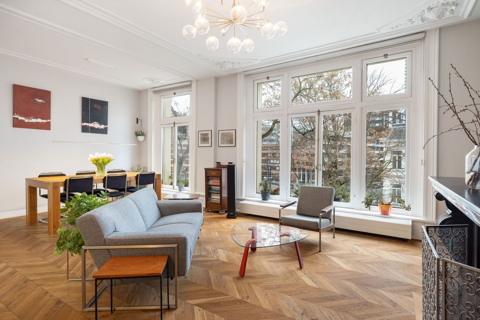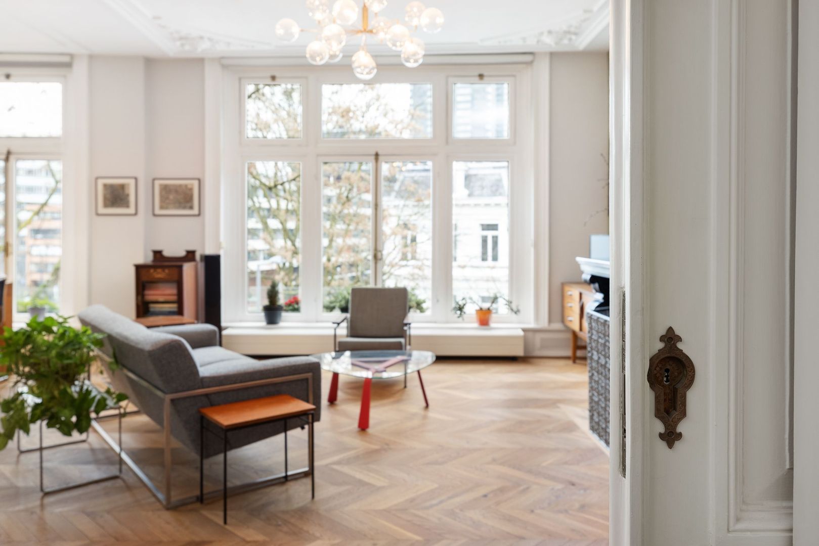 Brede, hoge woonkamer (1) ca. 41m² met indrukwekkend geornamenteerd plafond, antieke zwartmarmeren schouw met open haard en twee kolossale glaspartijen aan de straatzijde.