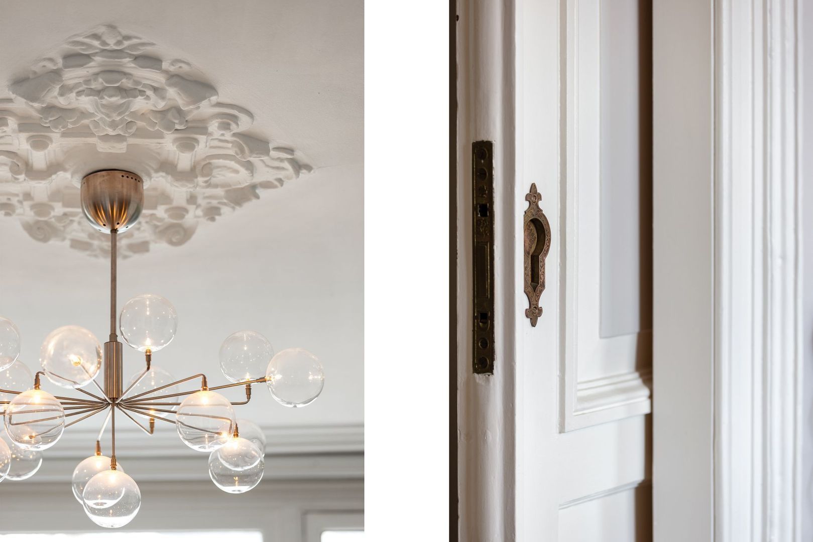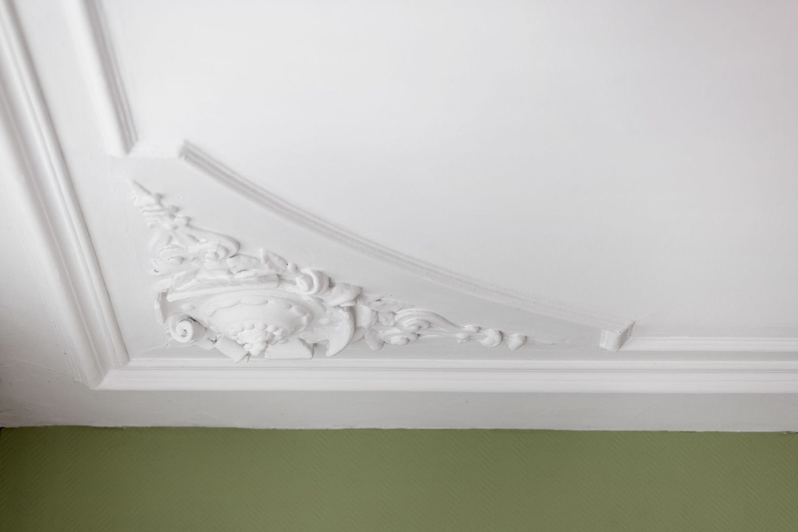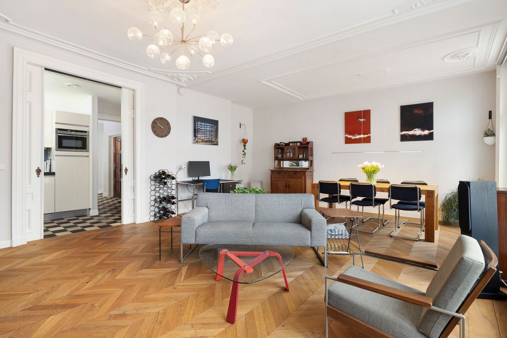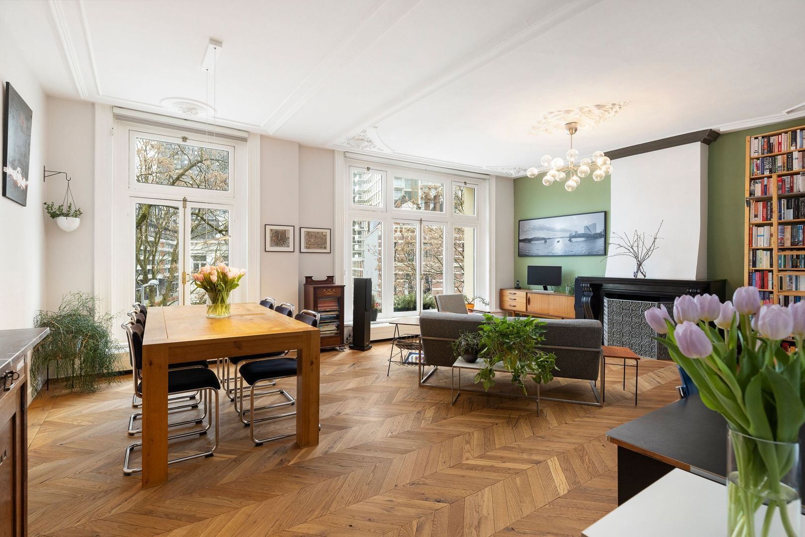 Brede, hoge woonkamer (1) ca. 41m² met indrukwekkend geornamenteerd plafond, antieke zwartmarmeren schouw met open haard en twee kolossale glaspartijen aan de straatzijde.