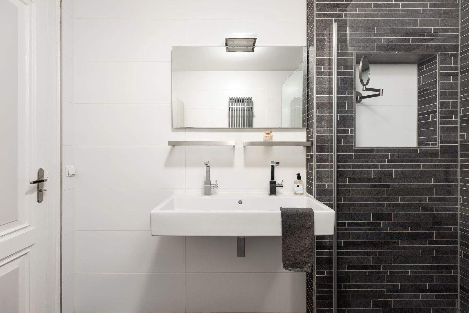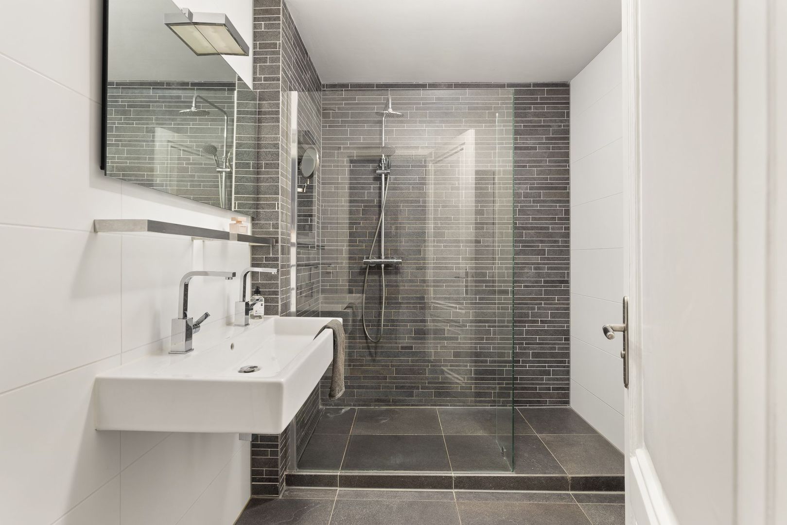 Badkamer met inloopdouche en wastafel voor ‘dubbel gebruik’.
