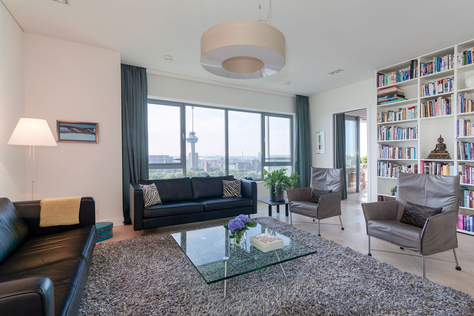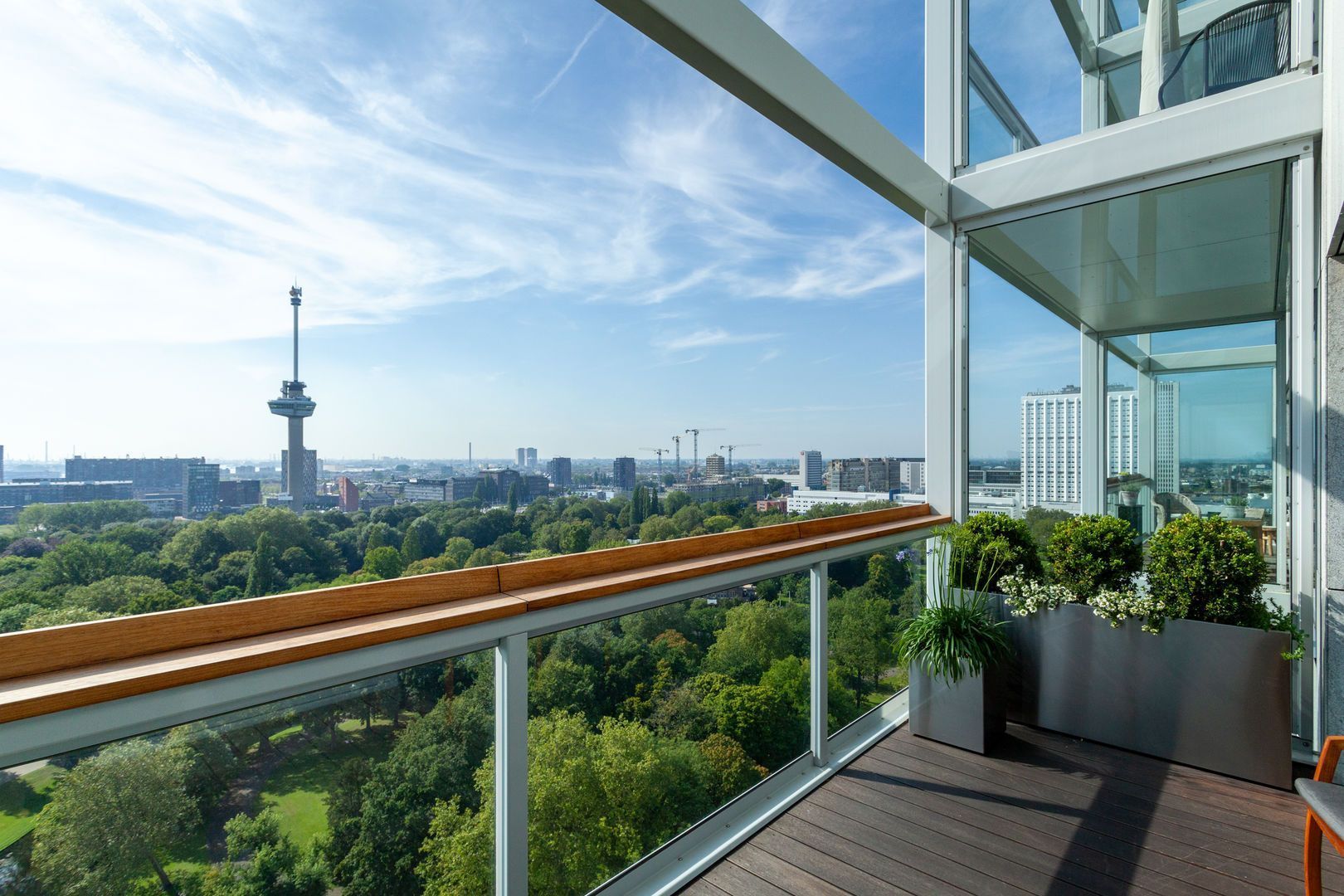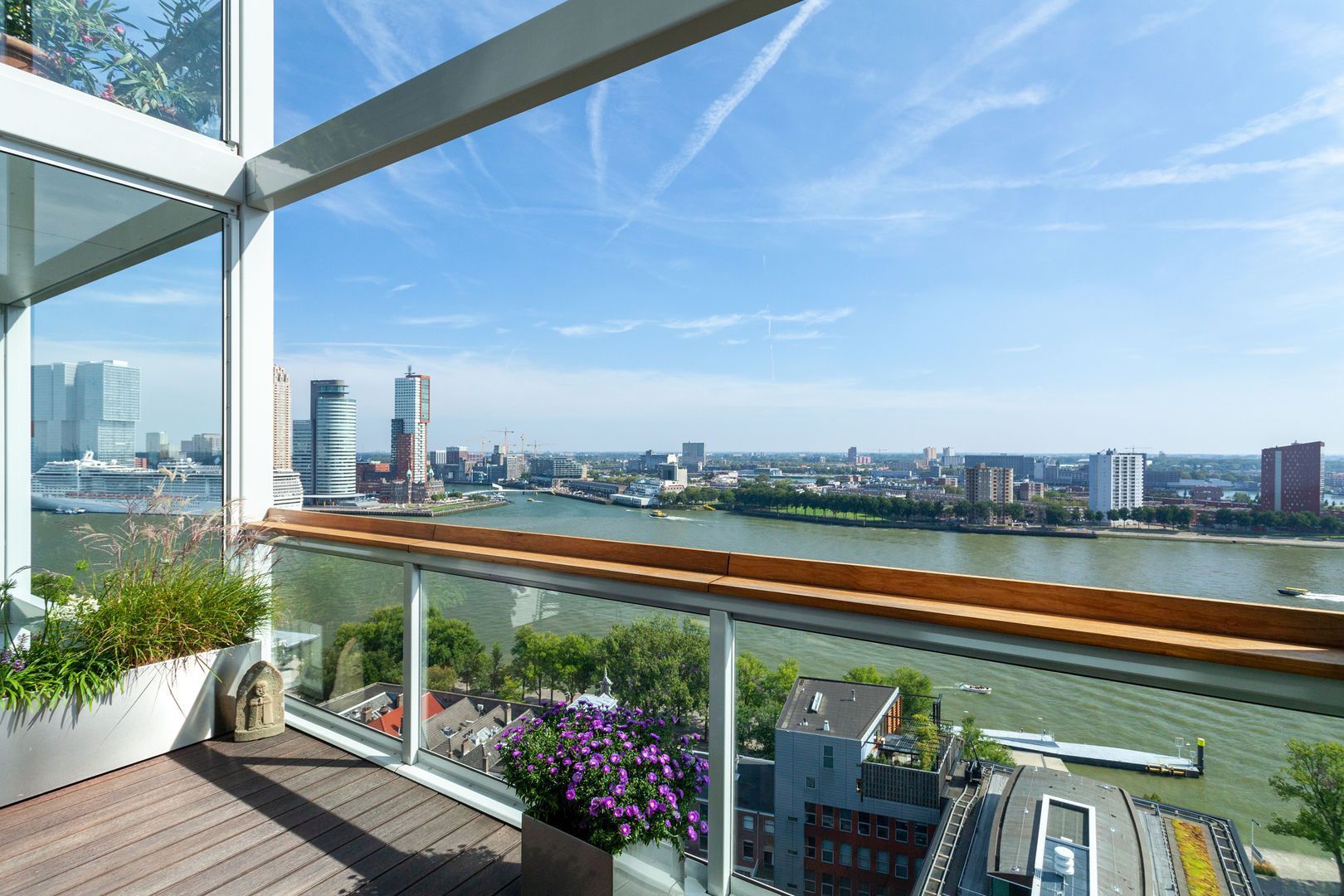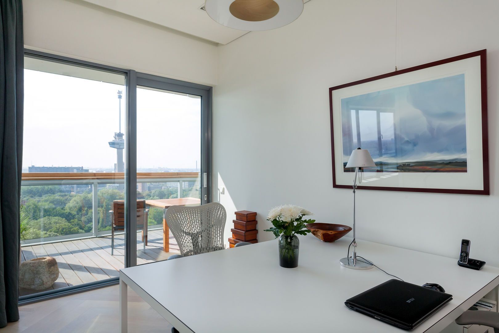 Bovendien is vanuit beide kamers, met glazen schuifdeuren het West gelegen terras (ca.13m²) bereikbaar, met uitzicht over de Maas, Het Park en de Euromast. .
