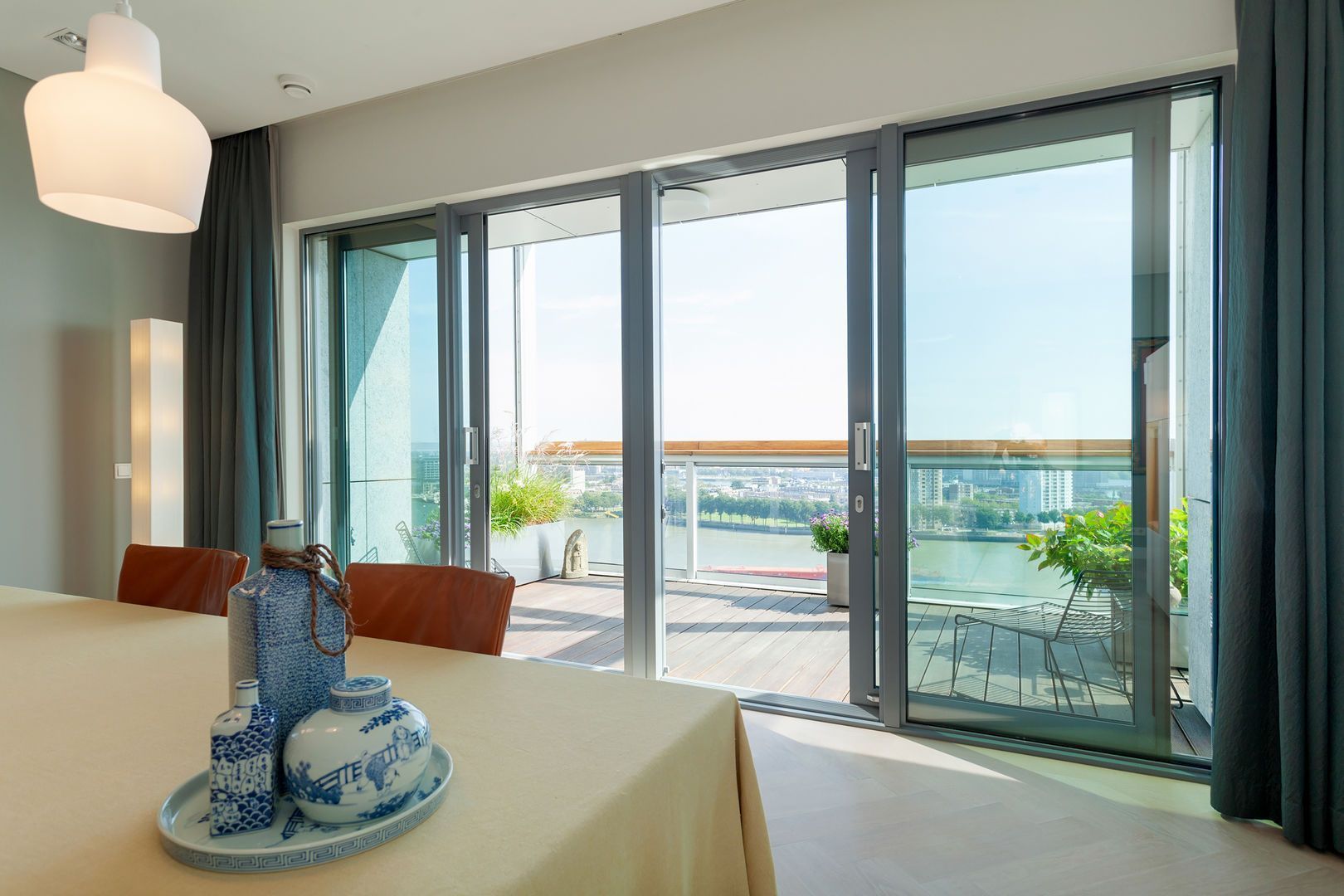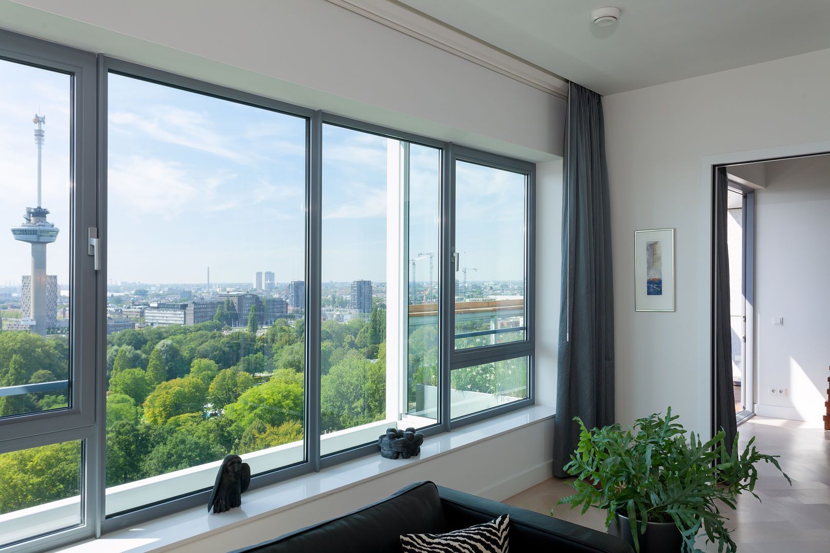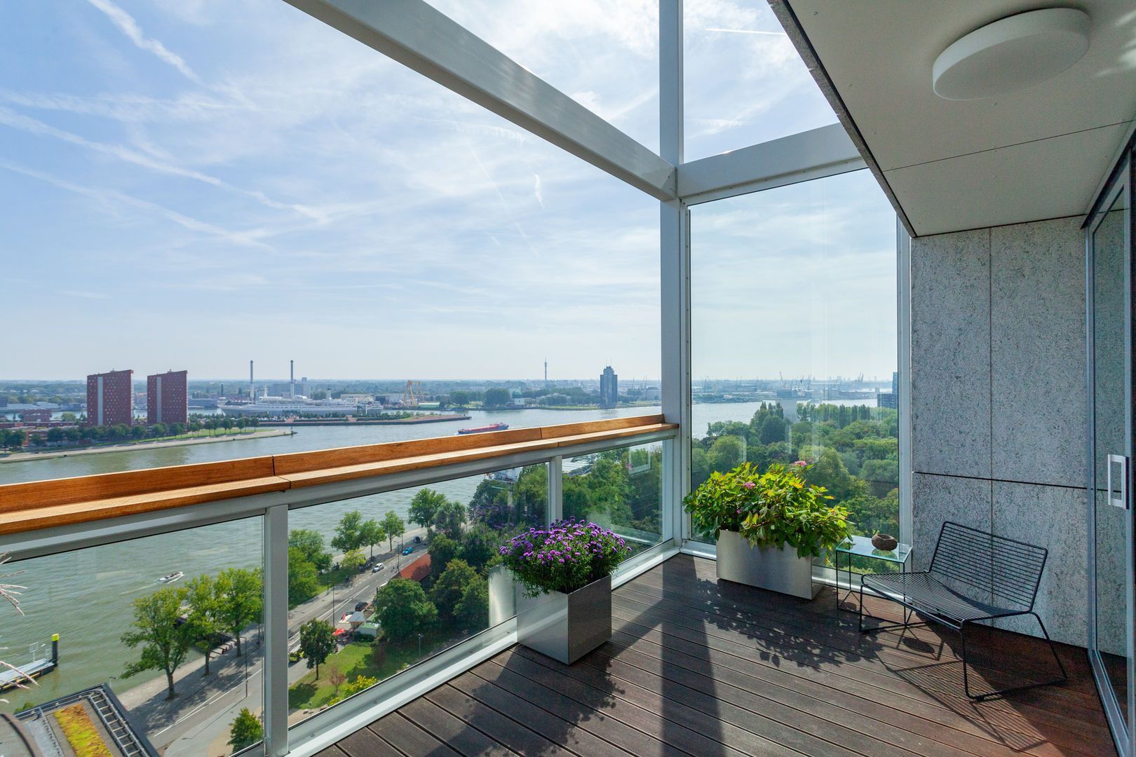 Bovendien is vanuit beide kamers, met glazen schuifdeuren het West gelegen terras (ca.13m²) bereikbaar, met uitzicht over de Maas, Het Park en de Euromast. .