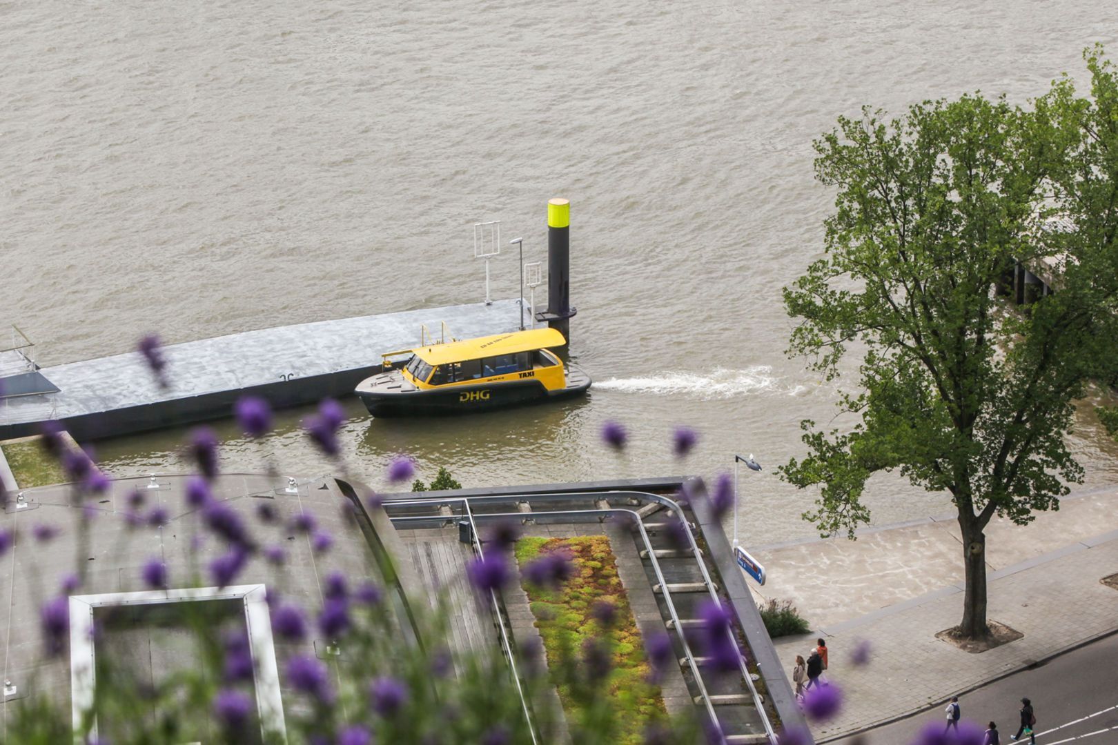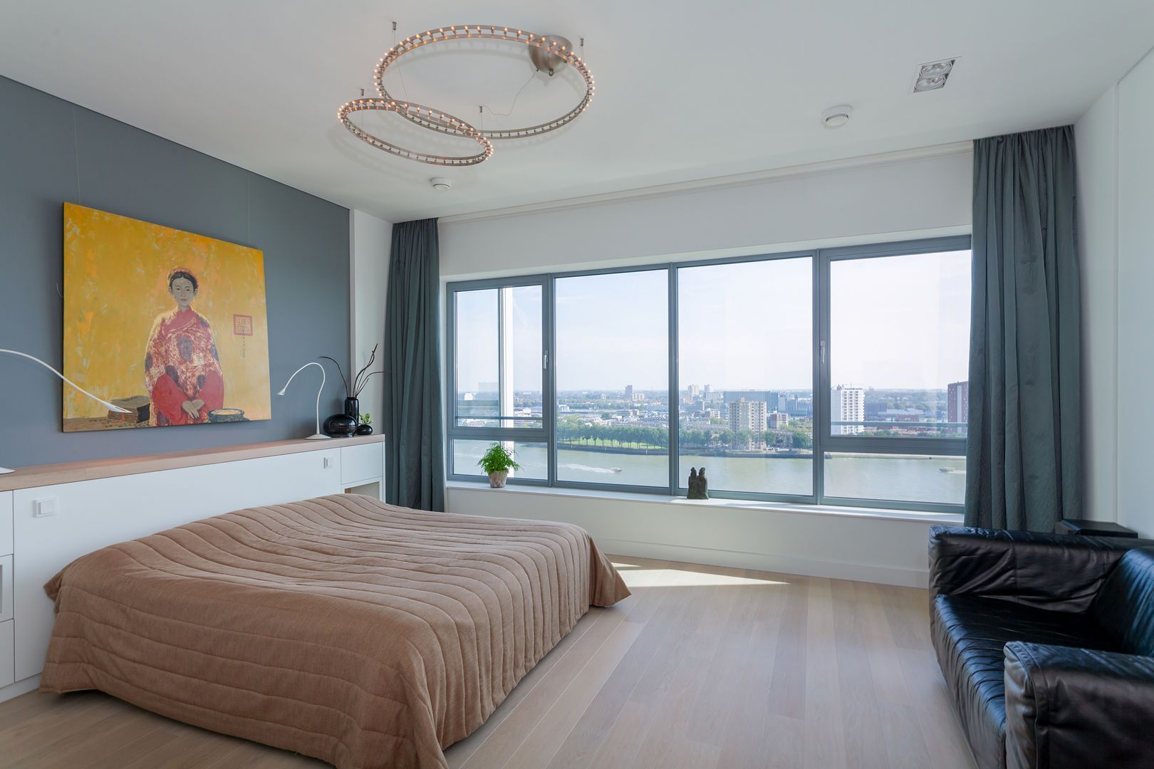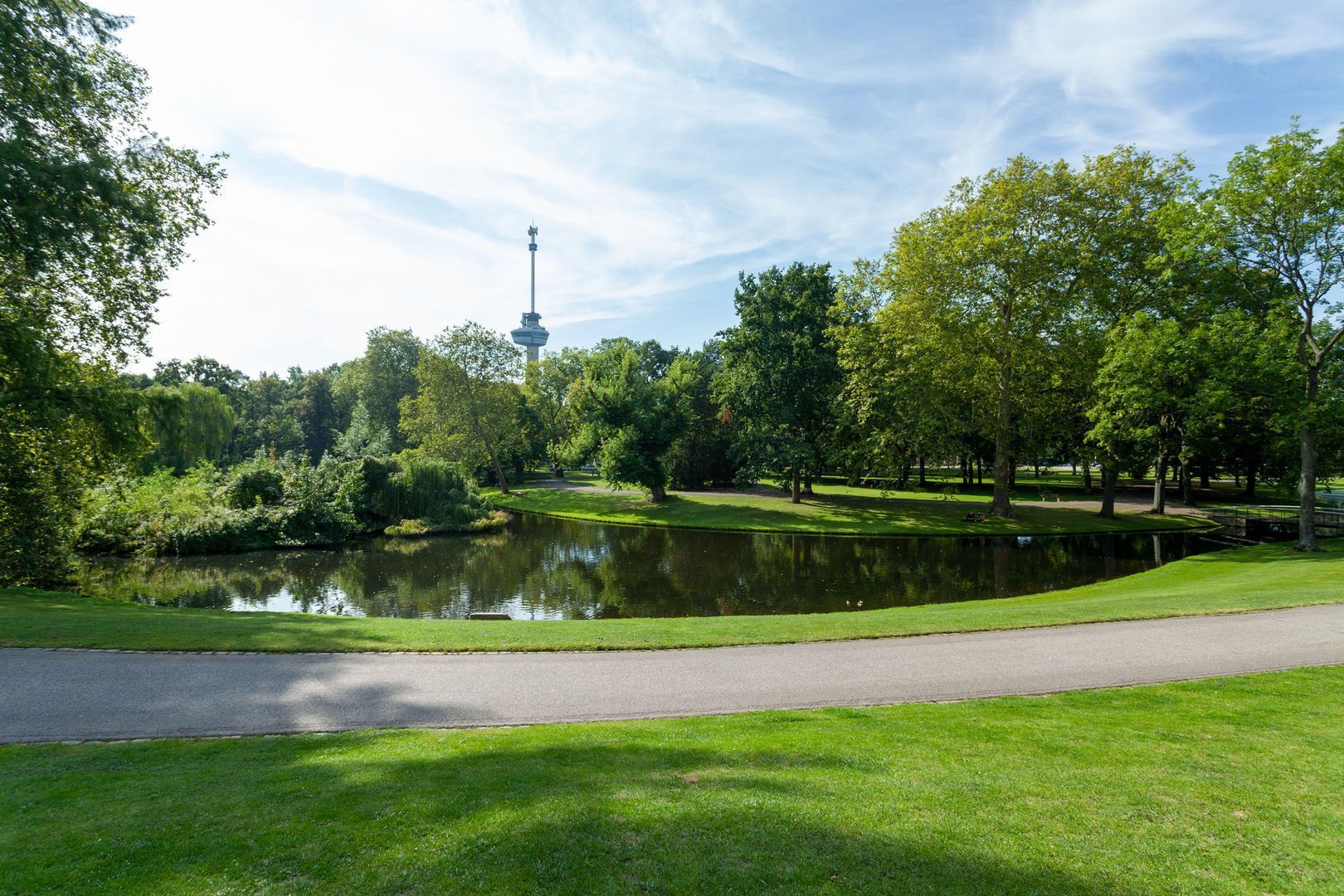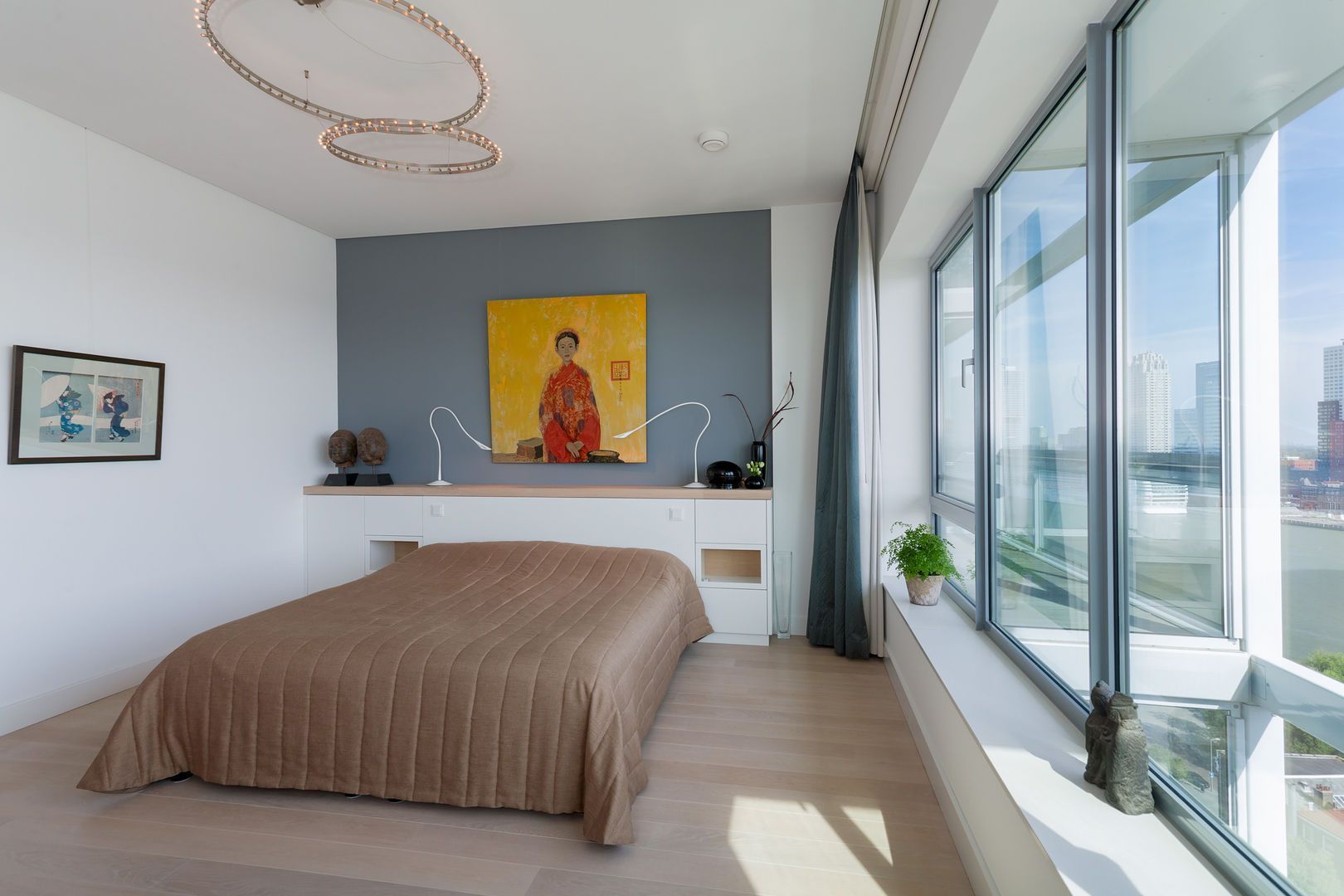 Bovendien is vanuit beide kamers, met glazen schuifdeuren het West gelegen terras (ca.13m²) bereikbaar, met uitzicht over de Maas, Het Park en de Euromast. .