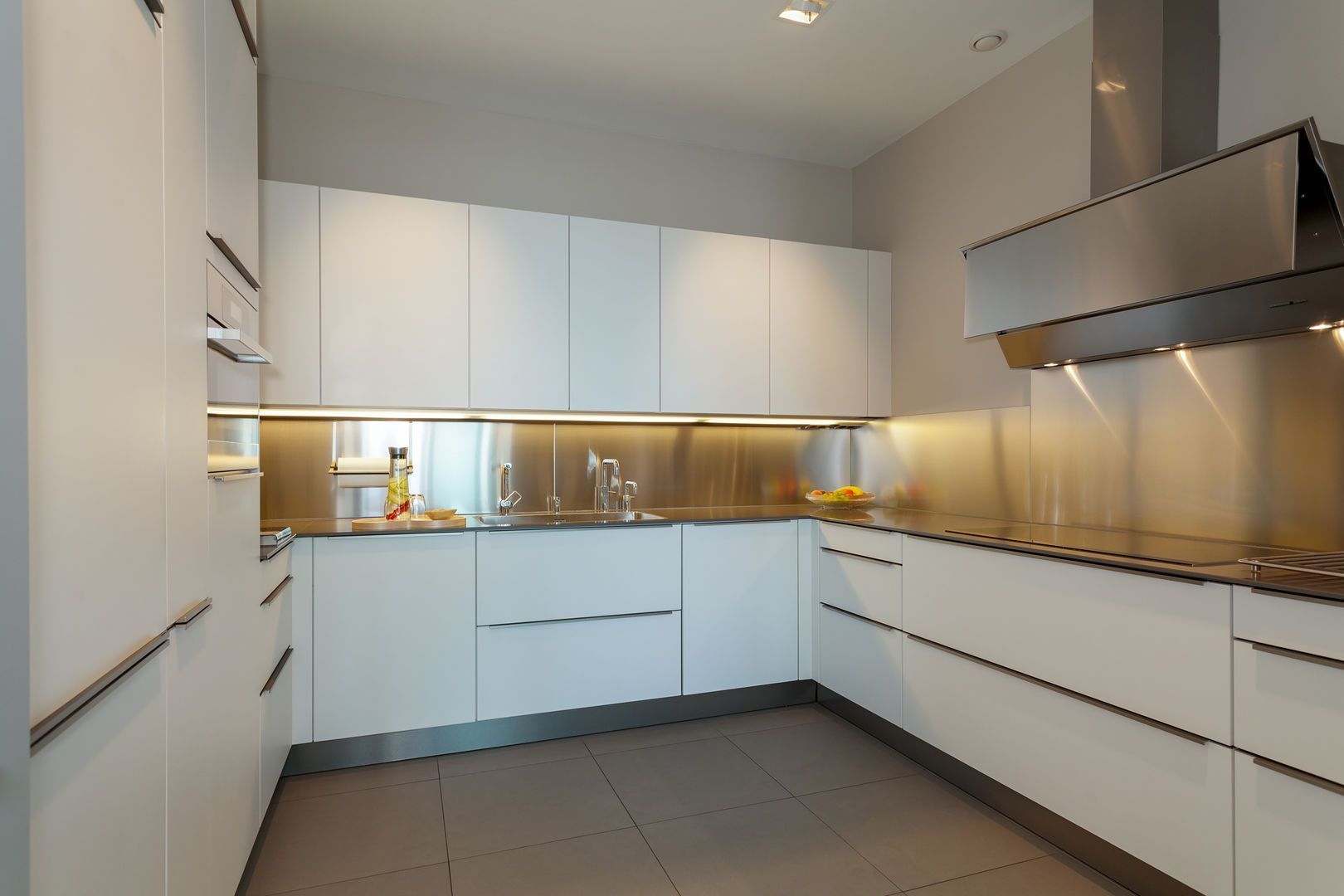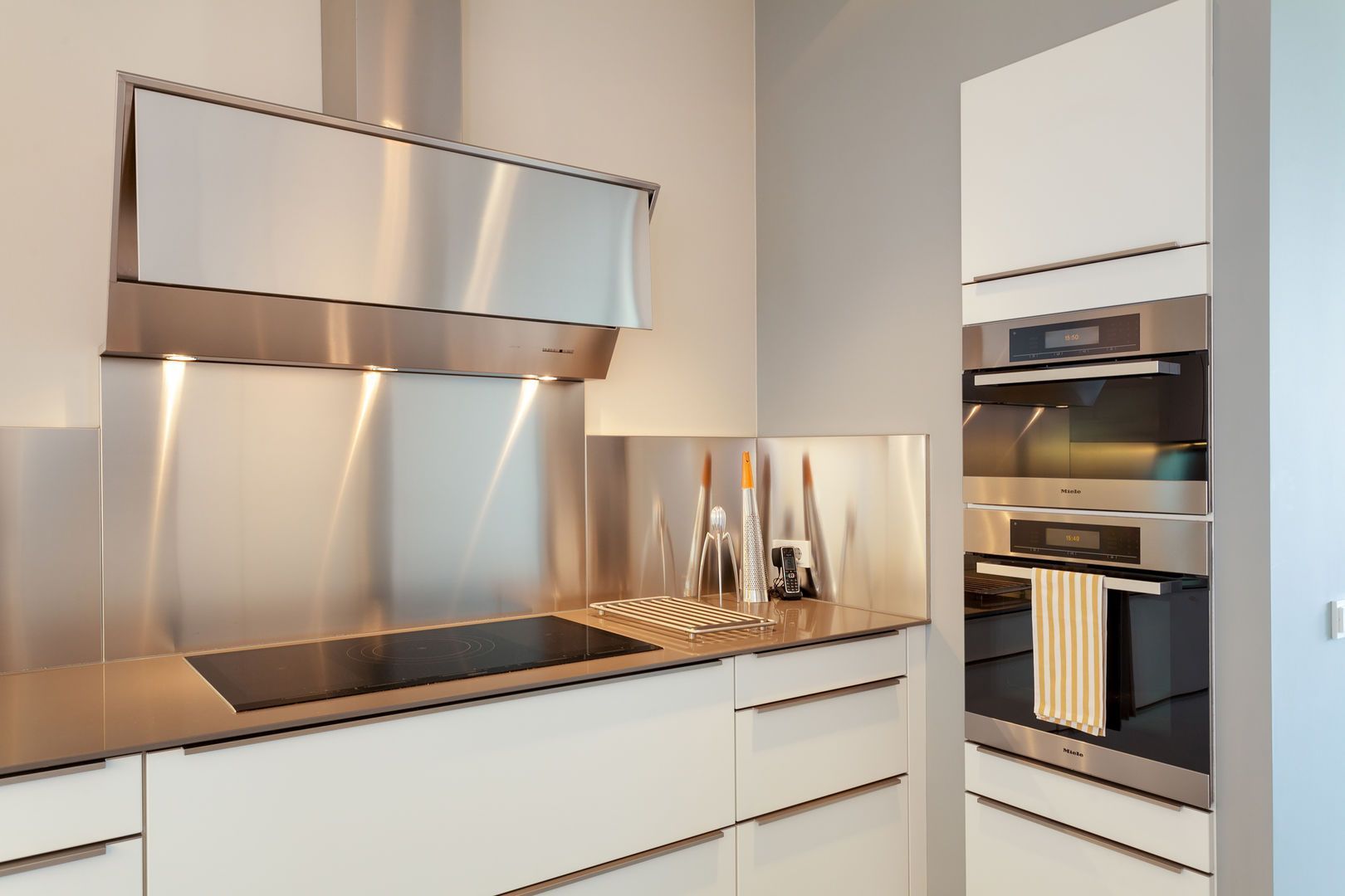Uitgangspunt bij het ontwerp is dat twee hobby kookliefhebbers voldoende werkruimte hebben. Deze ruimte is voorzien van grijs composiet aanrecht, Miele combi-stoomoven, combi-magnetron, bakoven, 90 cm brede inductiekookplaat, afzuigkap, vaatwasser, Liebherr koelkast, Liebherr vriezer, Quooker en extra grote spoelbak met dubbele kranen. B&W stereo geluidsbox is ingebouwd in het plafond.