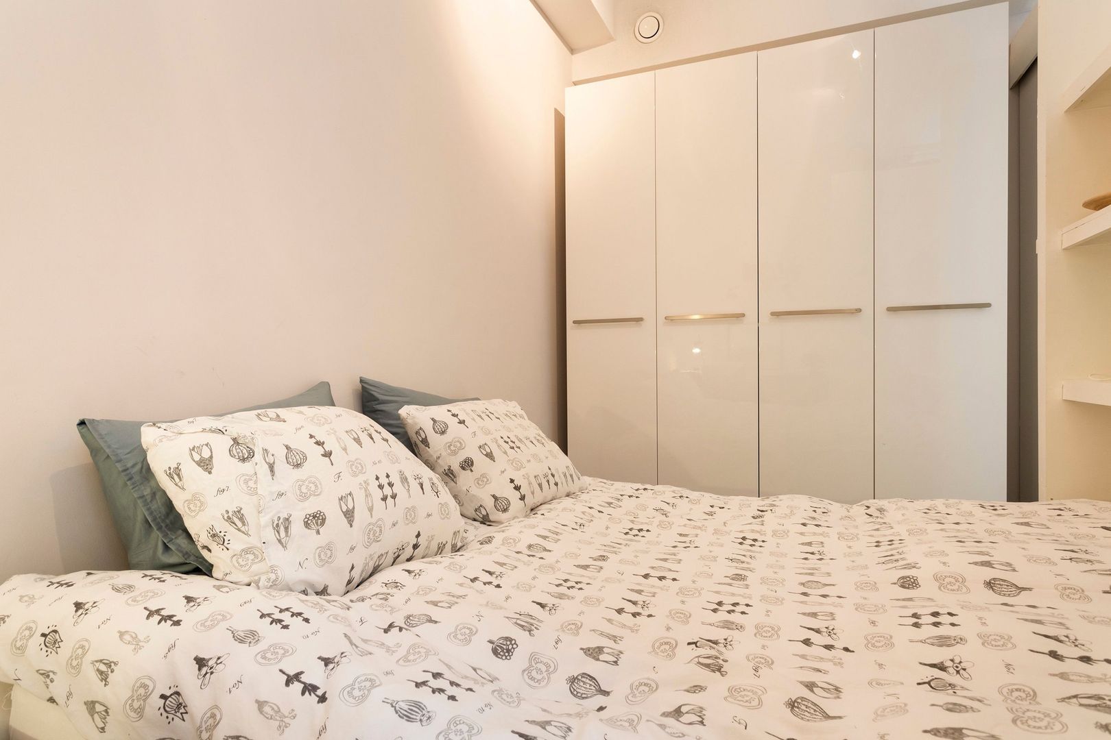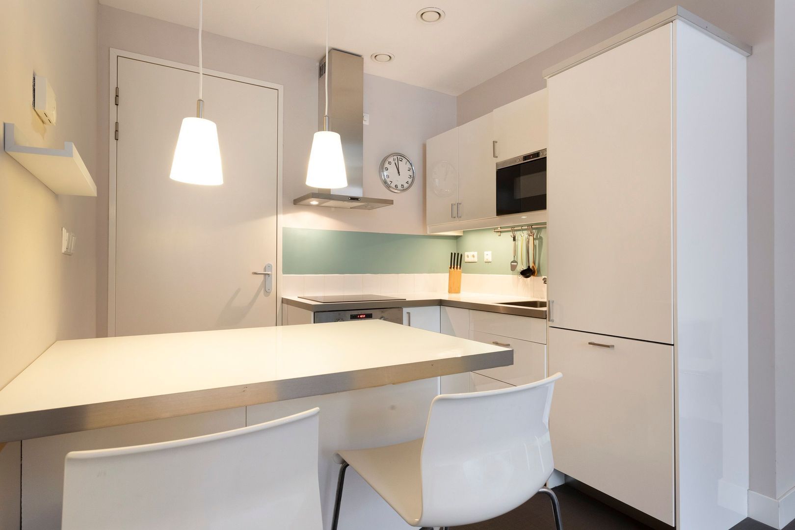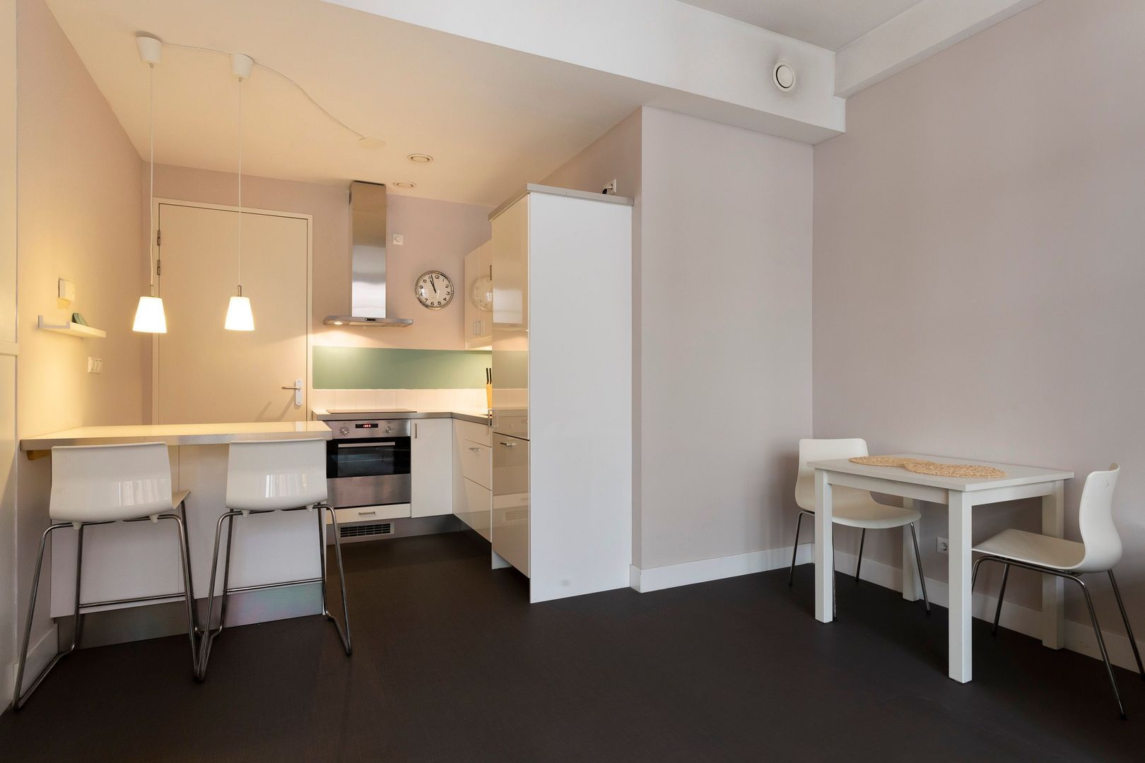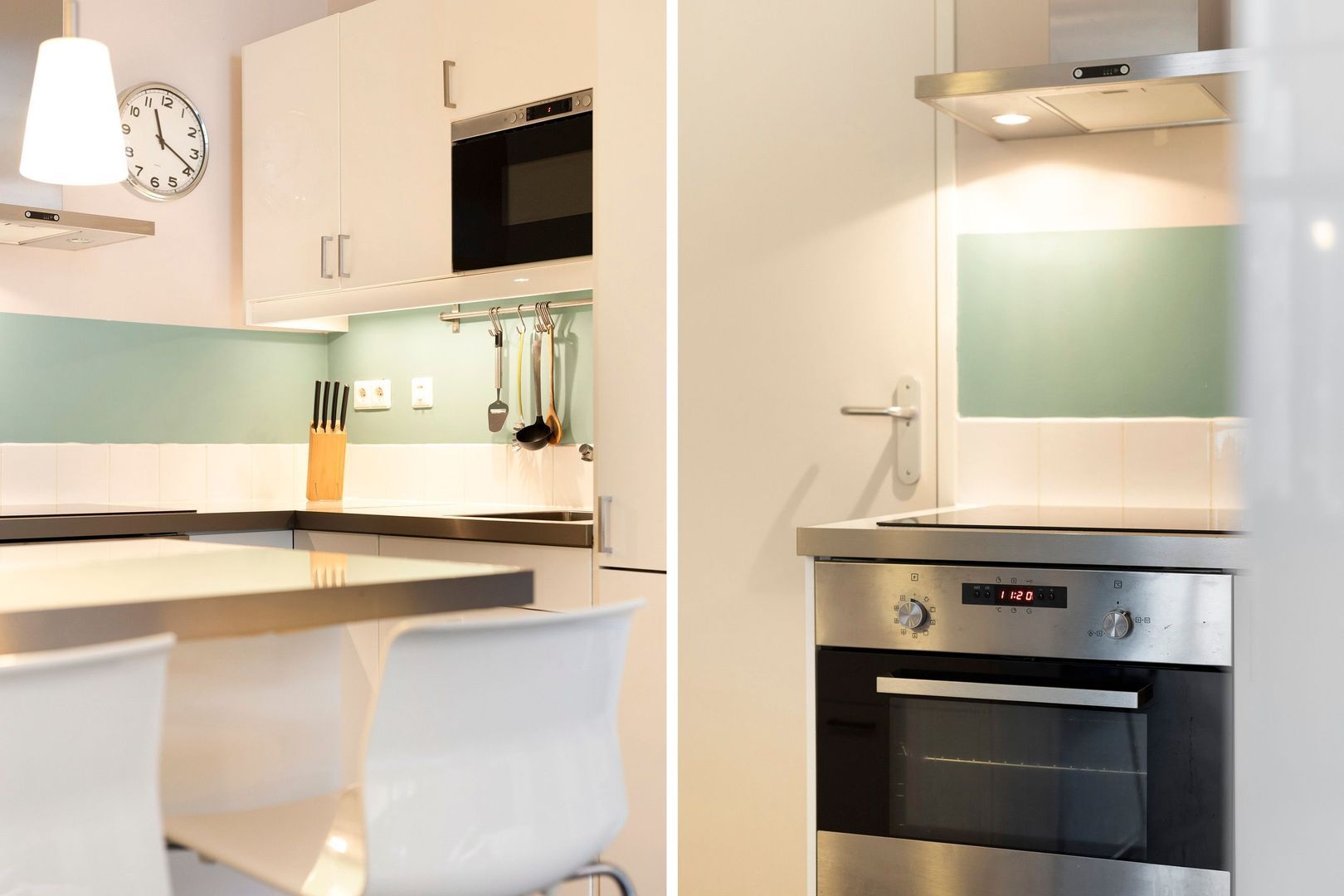 Living (1) met open keukenruimte met een witte L-vormige keukenopstelling met apparatuur. Slaapruimte (2) met kastenwand die met 2 schuifdeuren van de living is af te sluiten.