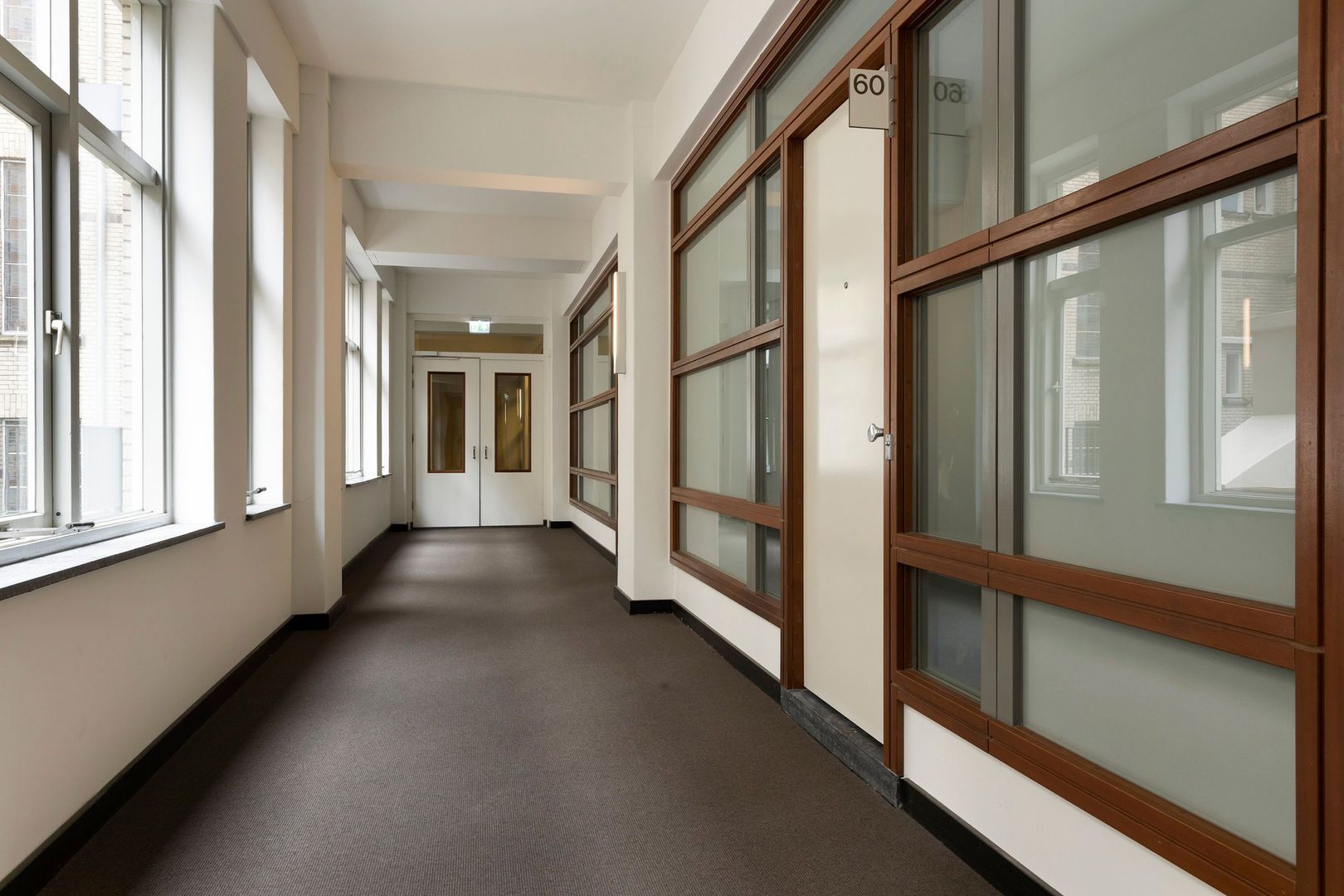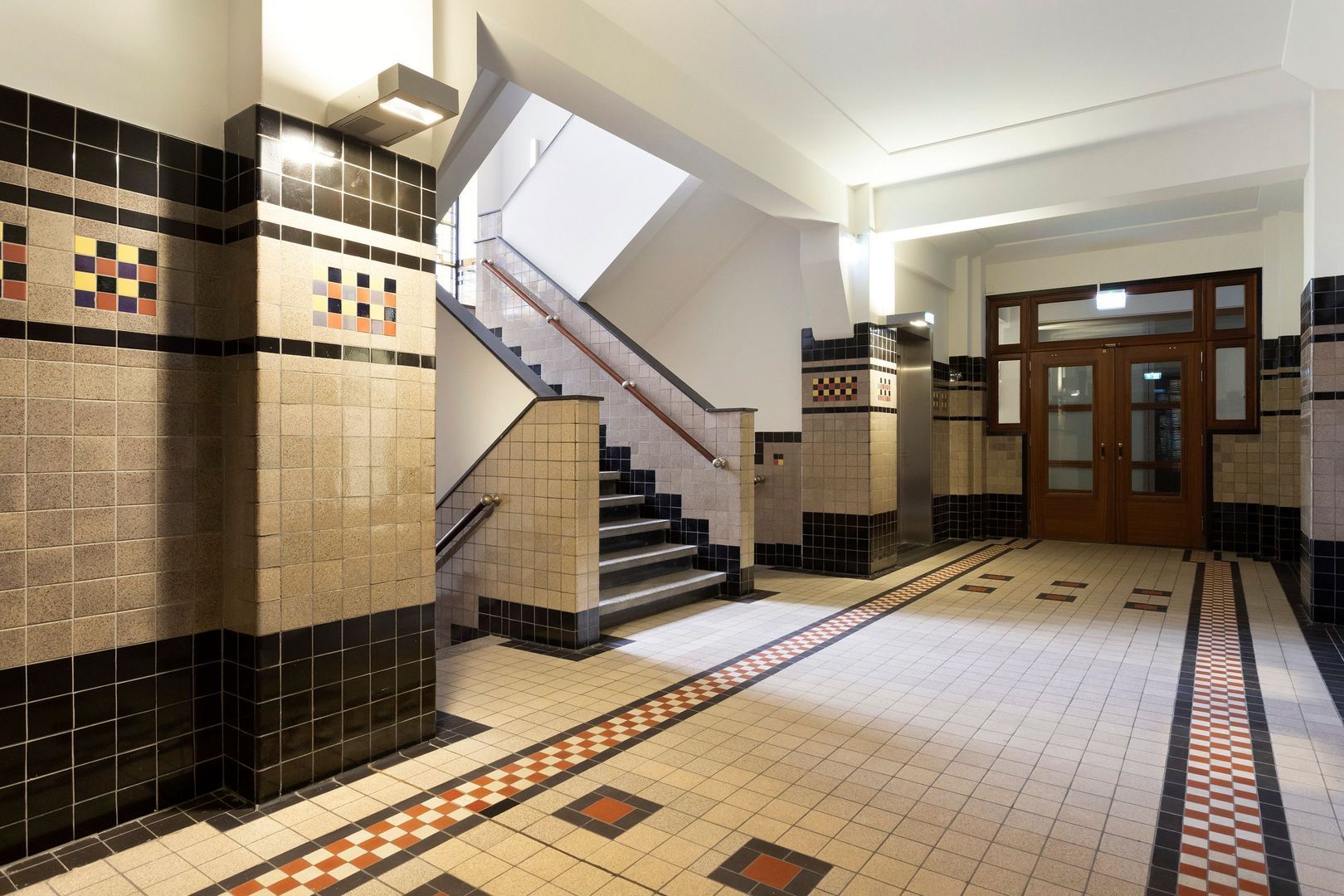 Majestueuze centrale hall met hernieuwde deurpartijen, mozaïekvloer, glas-in-lood raampartijen, monumentaal trappenhuis en toegang tot de liften en de parkeergarage en fietsenstalling.