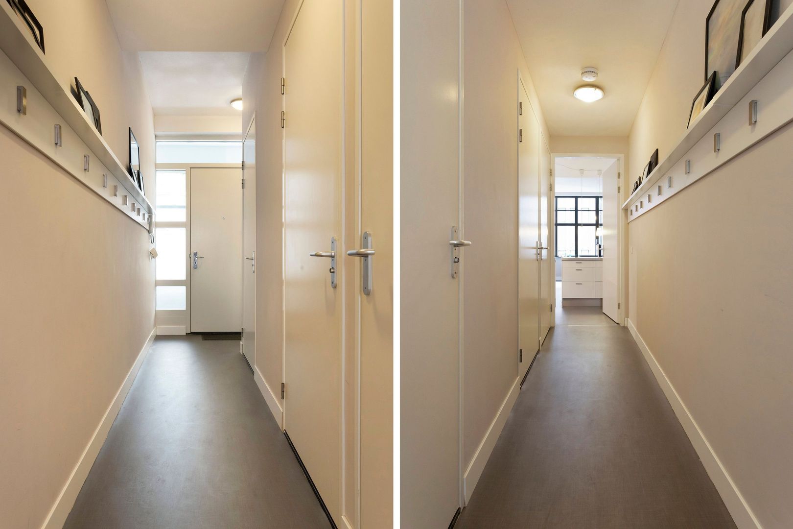 Entree, gang met toegang tot toiletruimte met hangend watercloset en fonteintje.