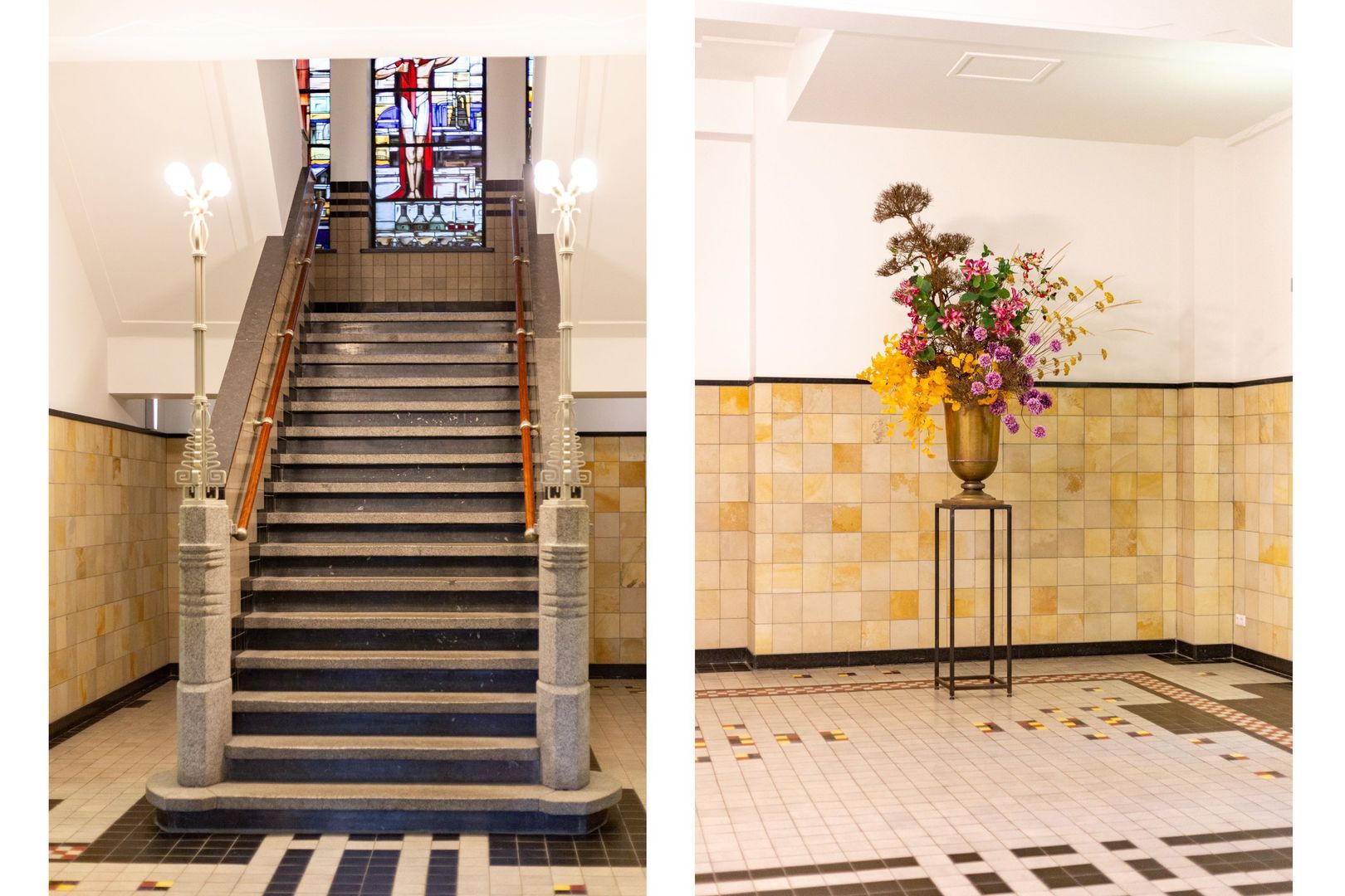 Toegang tot het appartement wordt verkregen door een gemeenschappelijke voordeur, die toegang geeft tot een centrale hal. Hier bevinden zich de brievenbussen en intercom. De deur, die toegang geeft tot het trappenhuis, kan net als de voordeur vanuit het appartement via intercom worden geopend. Er is een monumentaal trappenhuis in art deco stijl, die aan beide zijden is voorzien van een lift. Er is toegang tot de garage, de gemeenschappelijke FIETSENSTALLING en de berging. De centrale hal beschikt over een prachtige mozaïekvloer en glas-en-lood-ramen, die verwijzen naar ‘de vroegere tijden’. Het parkeersysteem is via de Houtlaan bereikbaar.
